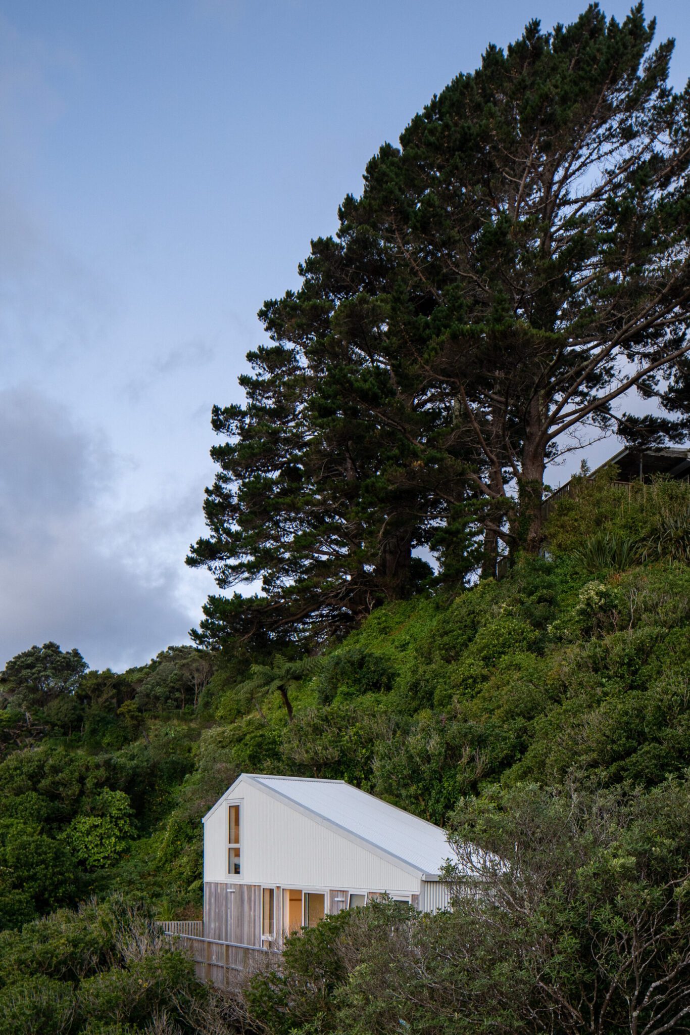 Cecile met Aaron Thornton and his partner Tomoko Hasegawa seven years ago when the young couple came to her with the hope of building on a steep site where the lushness of the bush-clad land was in sharp contrast to the sparseness of their budget. “It took them three years to get a mortgage, and, to save costs, they had to excavate the bank for the building platform themselves,” explains Cecile.