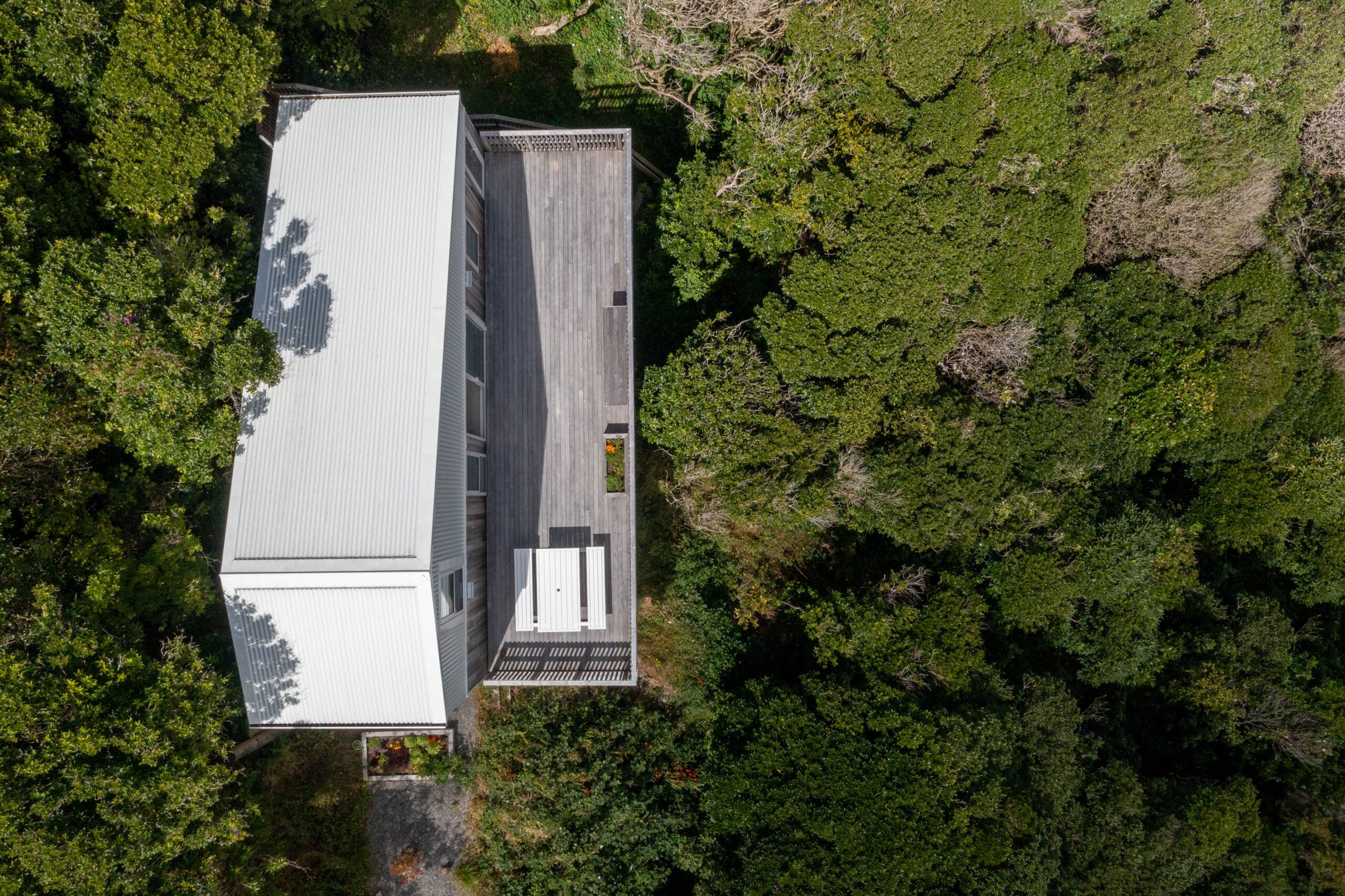 Many hard slogs up the hill later, the Mini FAB hovers in the trees — a little wedge of happiness. Part of keeping costs controlled was to avoid swathes of glazing. Its generous spatial qualities come courtesy of the double-height volume above the dining and kitchen zones and decking that flanks the western elevation. “I am claustrophobic myself so there is no way I would design something with no light,” adds Cecile.