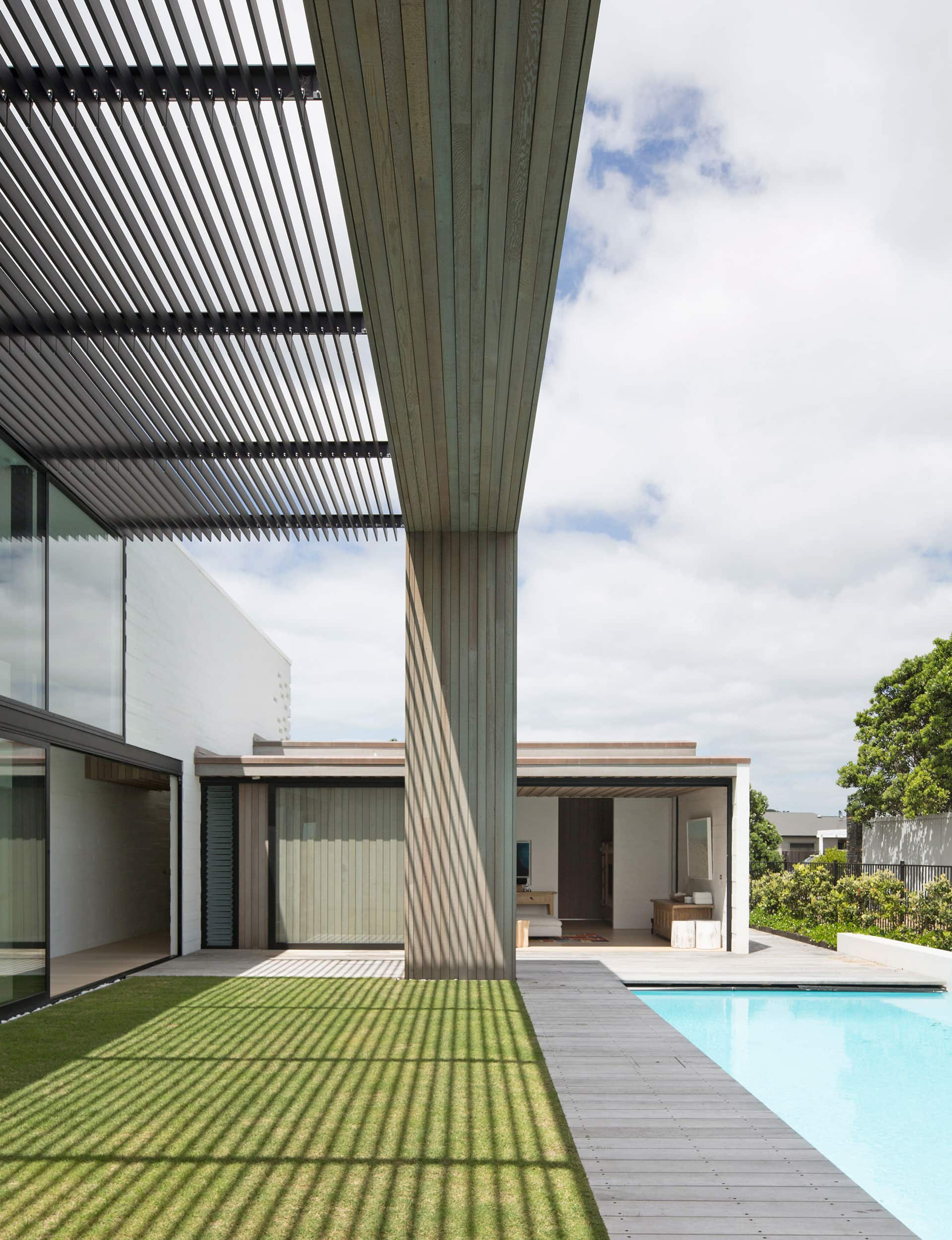 The plan wraps all the indoor and outdoor living spaces, along with the bunkrooms, around the west-facing courtyard containing both the pool and lawn areas. This facilitates easy connections between the various areas and provides space to both gather together or to escape.