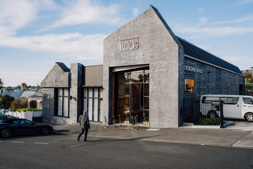 Now the home of the Designer Rugs showroom, the new building replaces two small workshops and warehouses, the former of which were cast-concrete buildings with characterful parapets and roof forms that were earthquake-prone and beyond repair.
