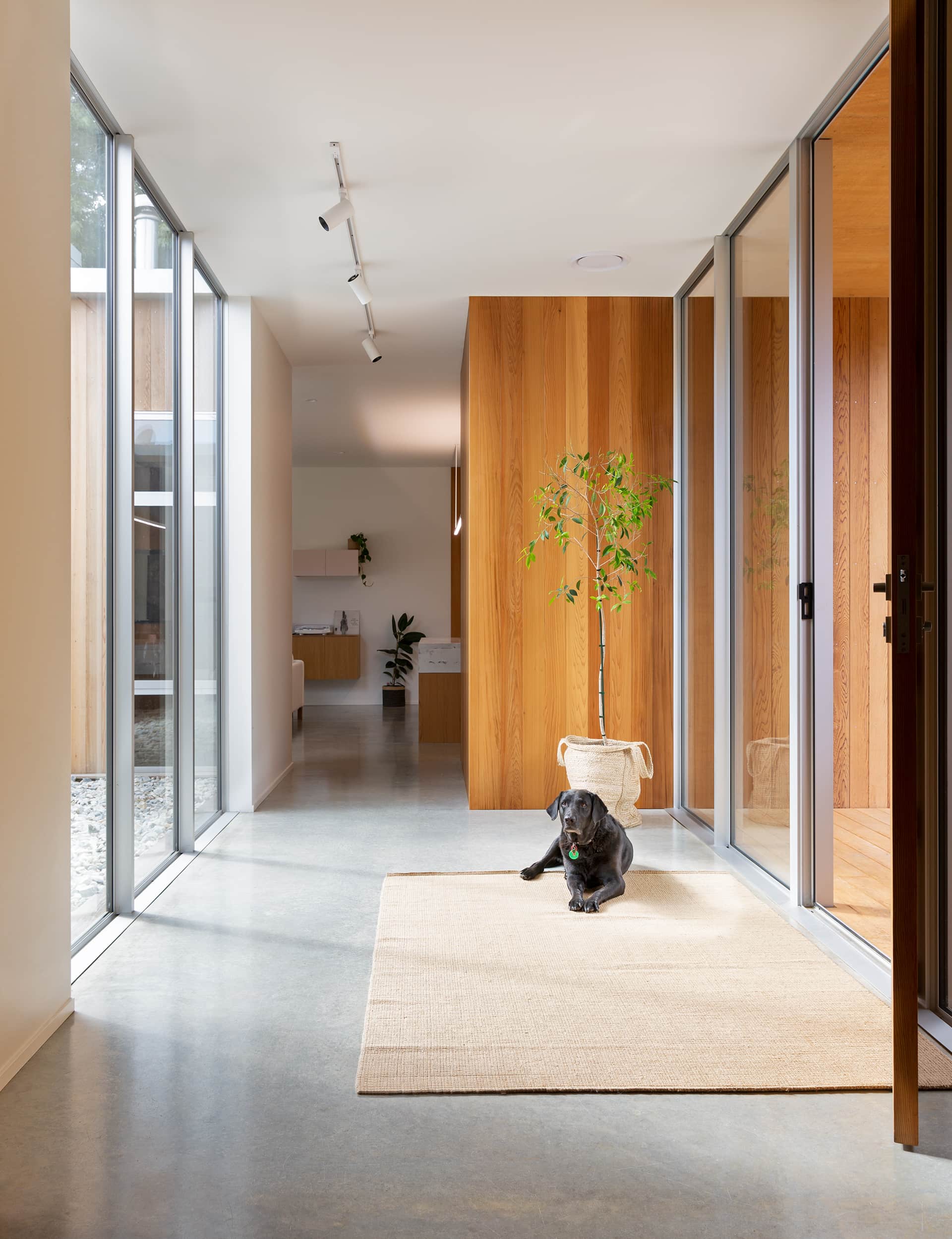 Arranging the programme around a central arrival point and incorporating a central garden allowed glazed areas that look across and inward. In addition to the internal passages, a large covered deck connects one side of the house to the other and promotes external circulation, creating an additional route or cross-link between the two main parts of the house. These combined ideas heighten connectivity and inform the layout to some degree.