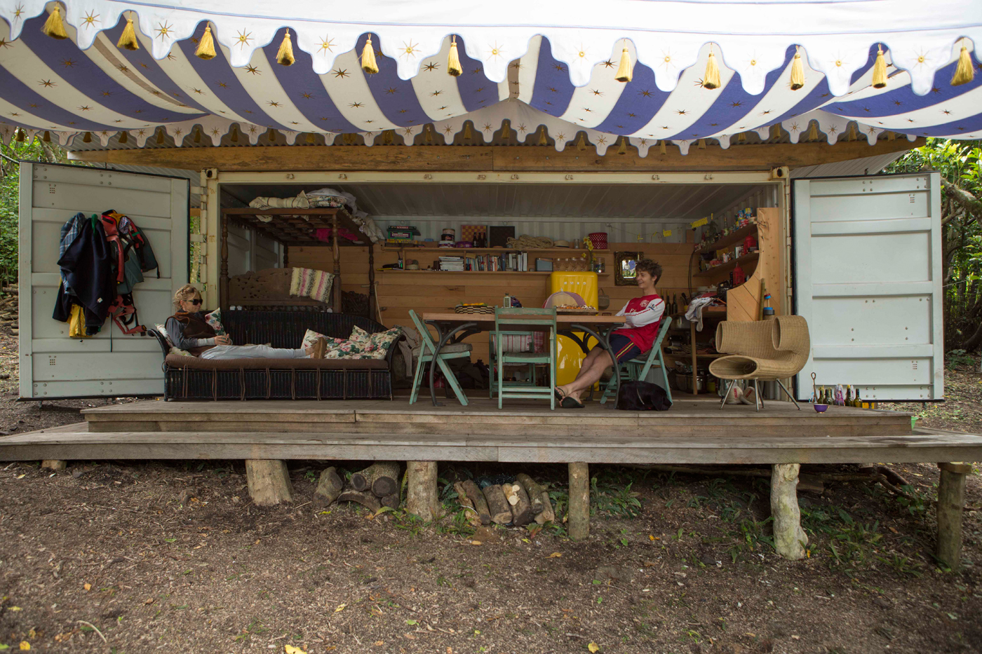 The container doubles in size by virtue of the deck which, when folded down, opens flush off the front. The roof was constructed (after the container came on site) with a large overhang so it doesn’t overheat and the deck never gets wet when it rains.