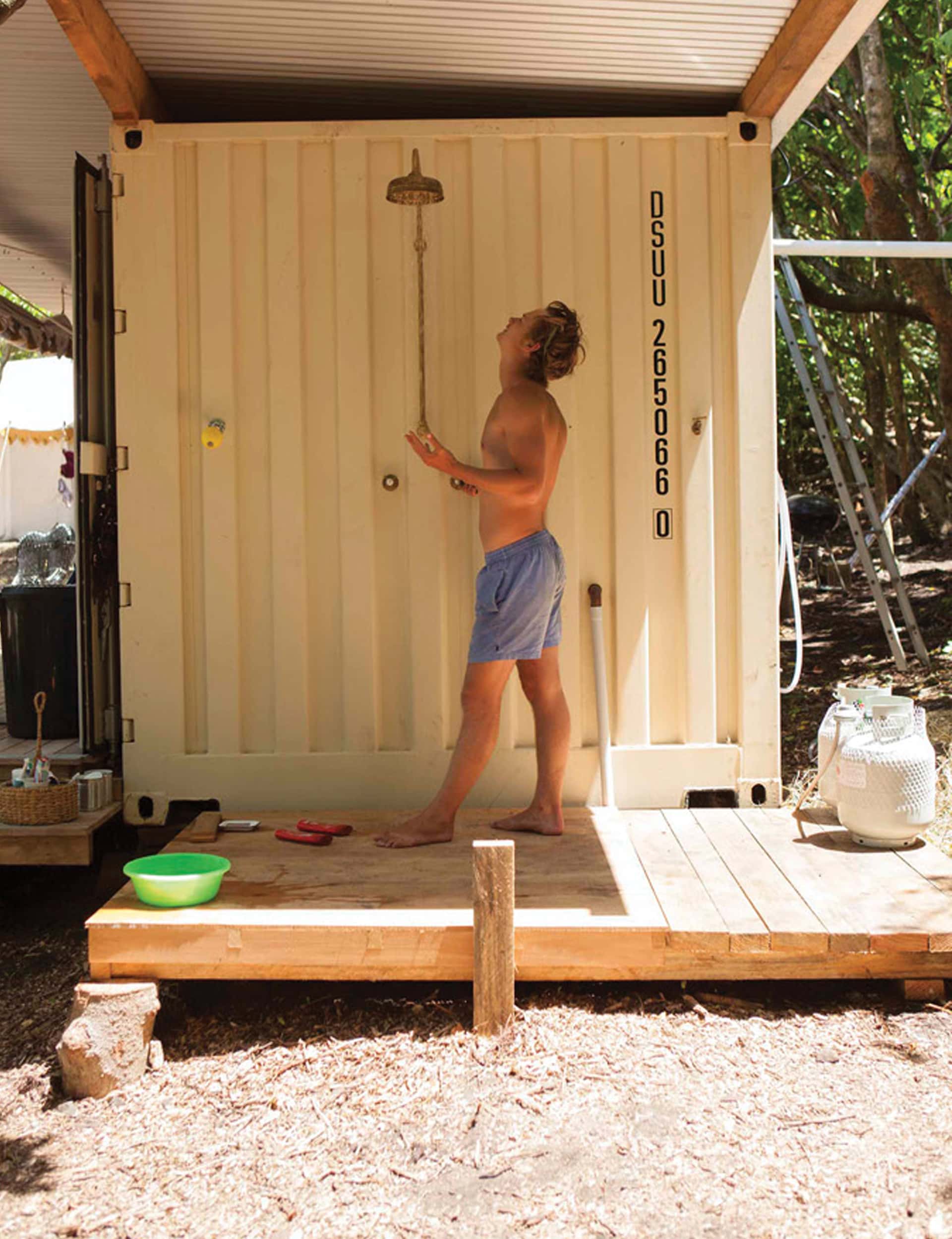 The container on the site was bought in Christchurch. It is just over six metres long and opens out completely on one side. My parents then customised it, lining it with raw macrocarpa boards, shelves and a washing-up bench. The doors, when opened, fold around at each end, forming an enclosure where they are attached to a deck with a brass showerhead, which shares the same plumbing as the sink.