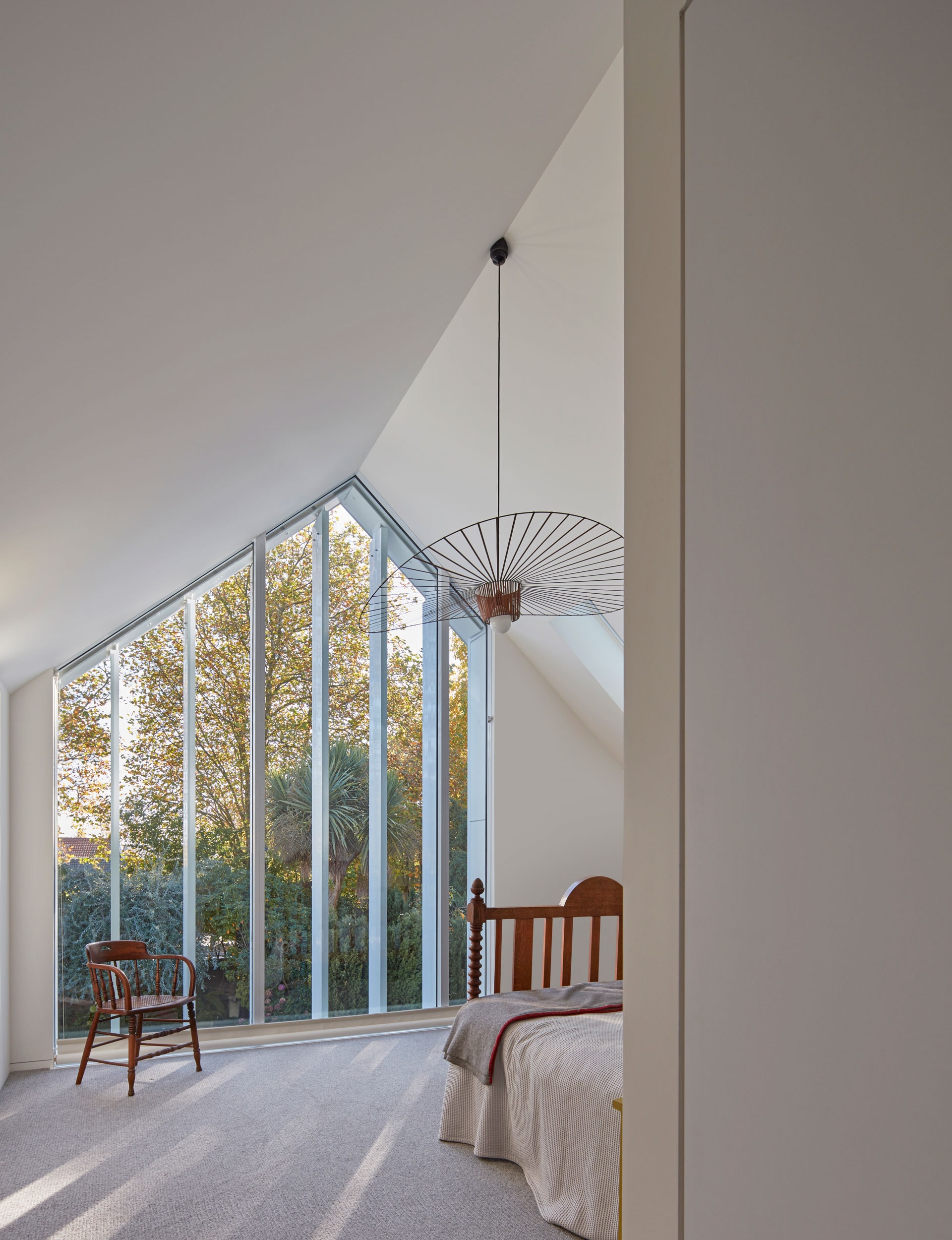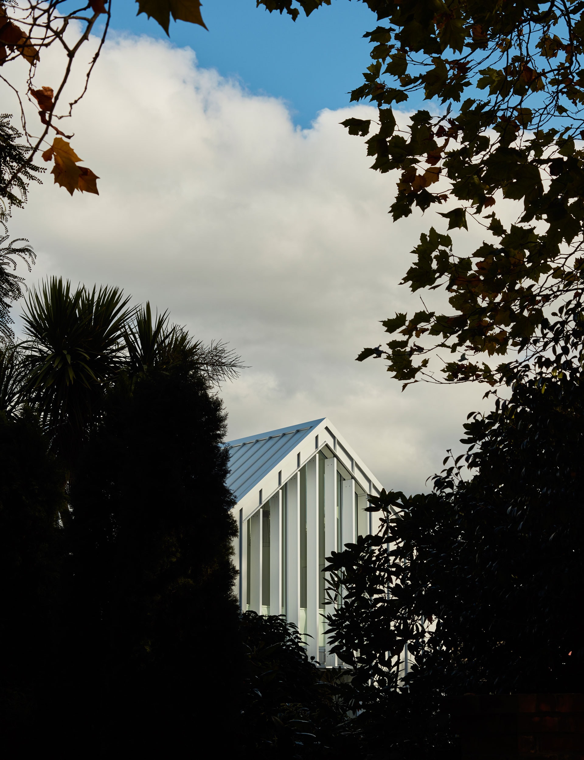 We learned a lot from that project, including how white steel and glass buildings sit wonderfully in a garden landscape. The framework of Ian and Liz’s garden falls within English traditions of a more formal approach, which tied into what we were doing for the visitor centre at the time. For the interior, we chose white because we wanted the house to form a backdrop for Liz and Ian’s art collection.