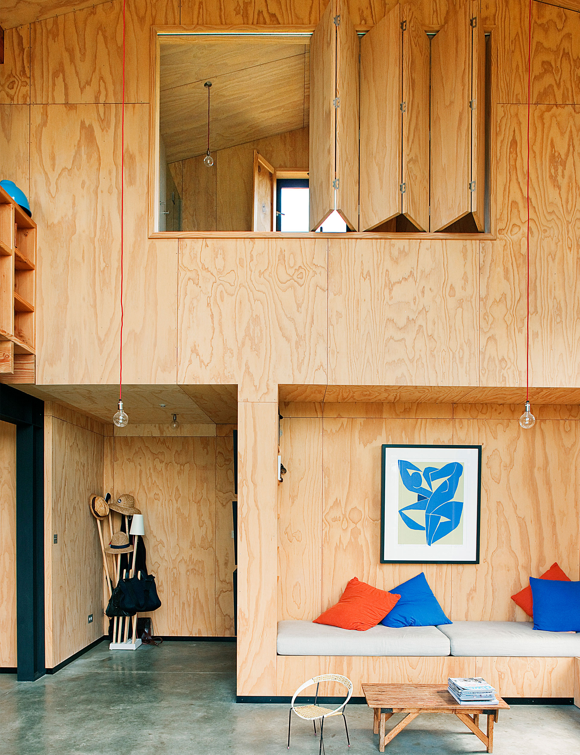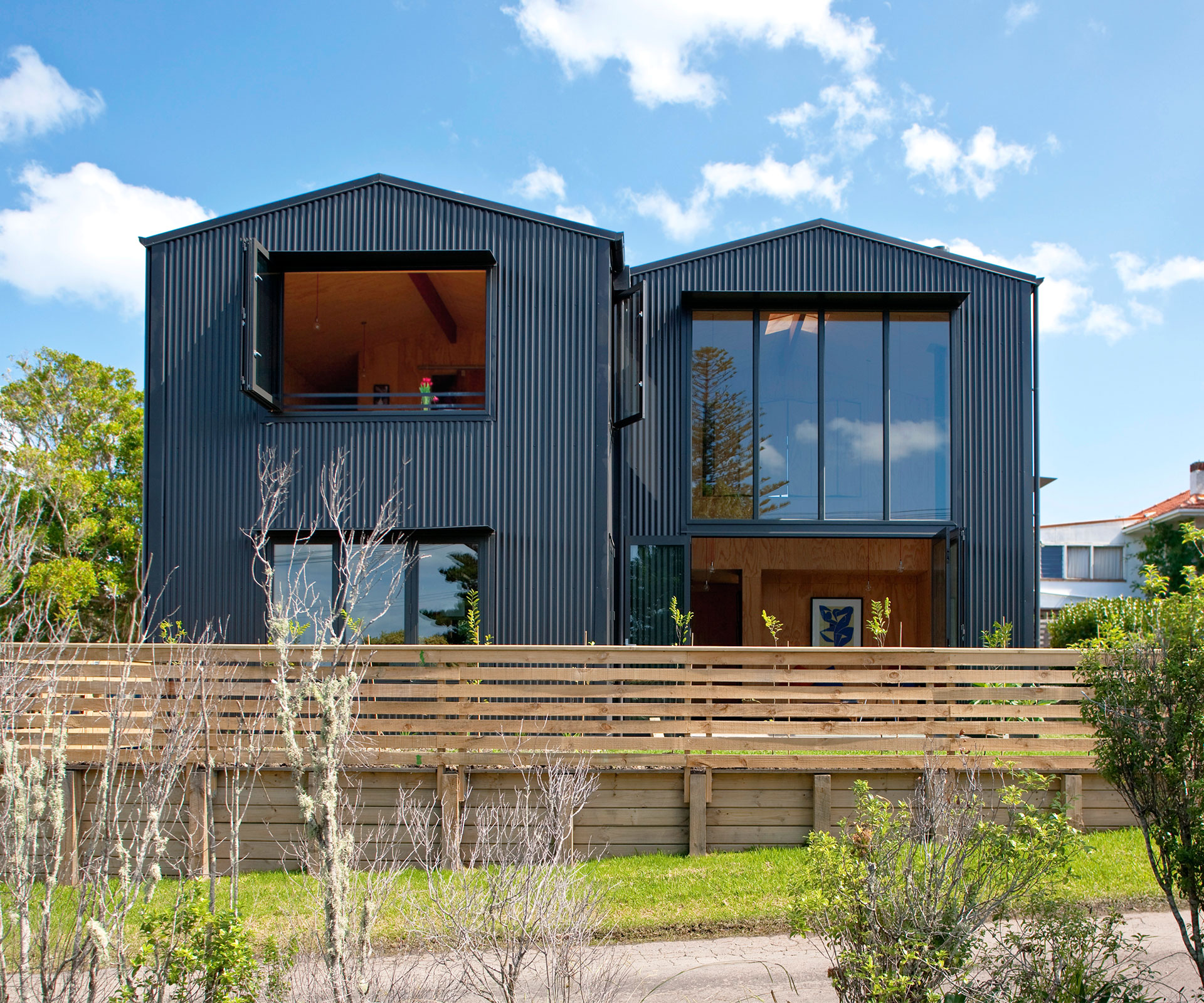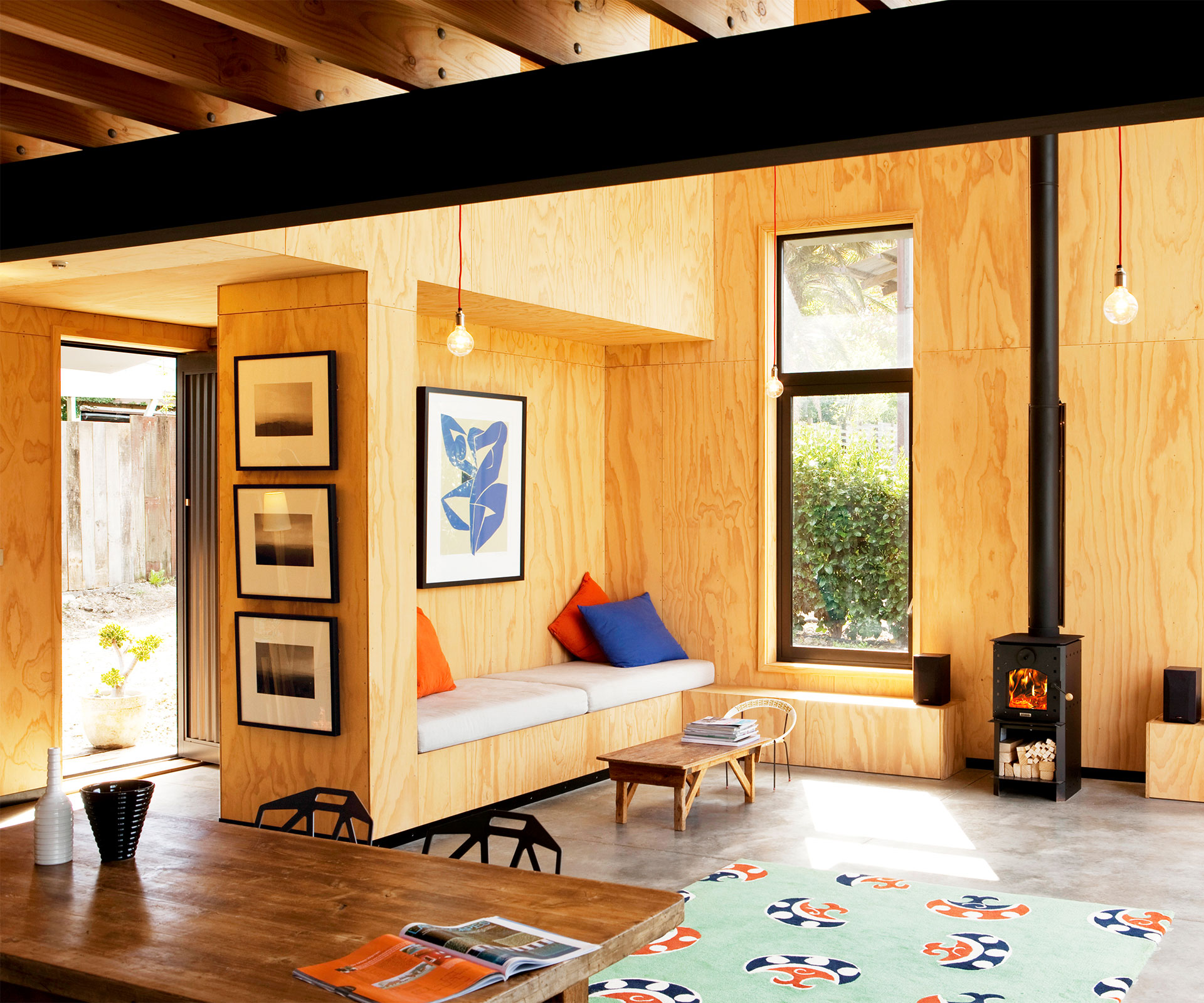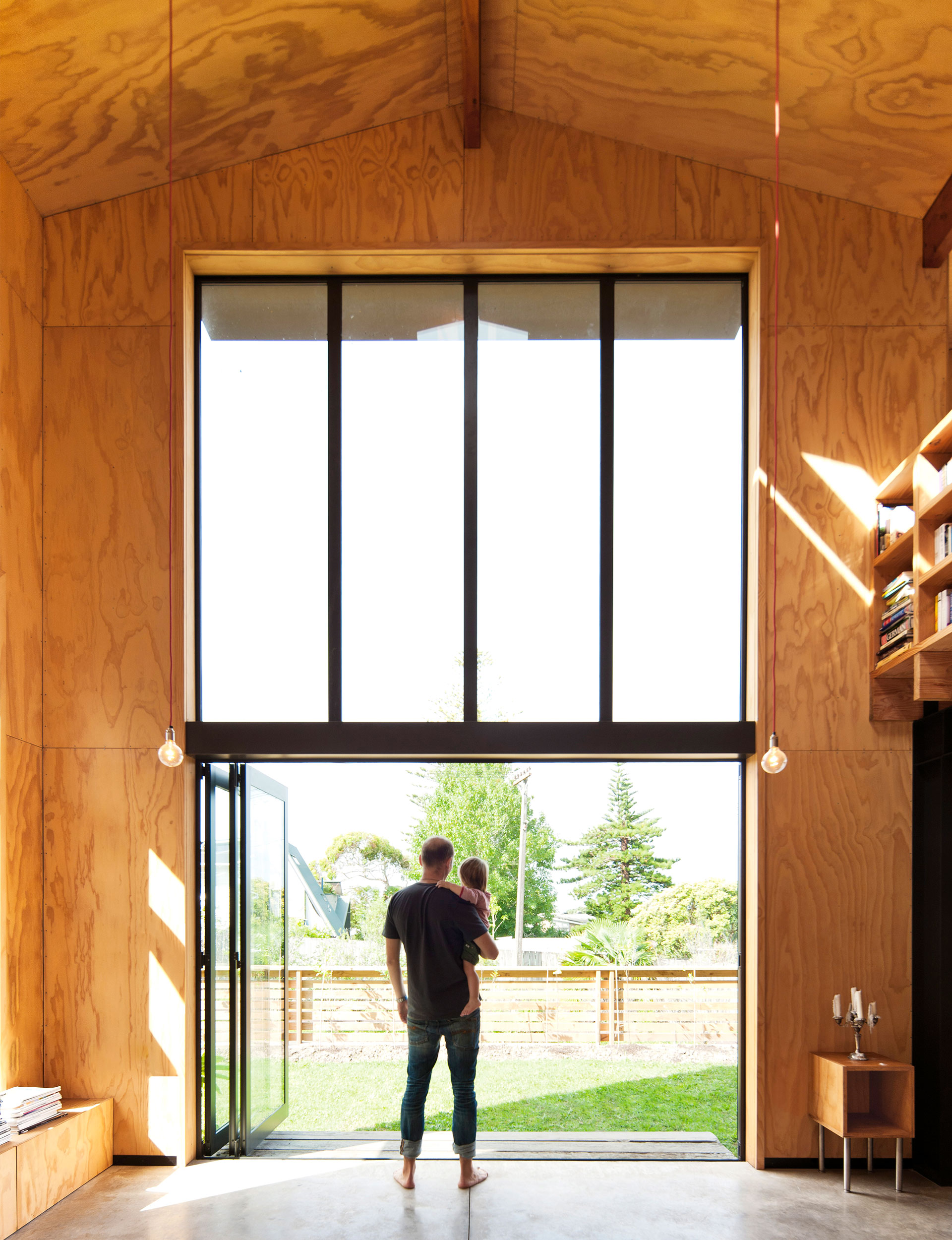 A small, simple design was key to making it cheap. Davor designed two adjacent, double-height, gable-roof forms, one thrust a metre forward of the other. A steel frame supports the junction of the two forms; otherwise, the frame is all timber, clad in ColorCote steel.