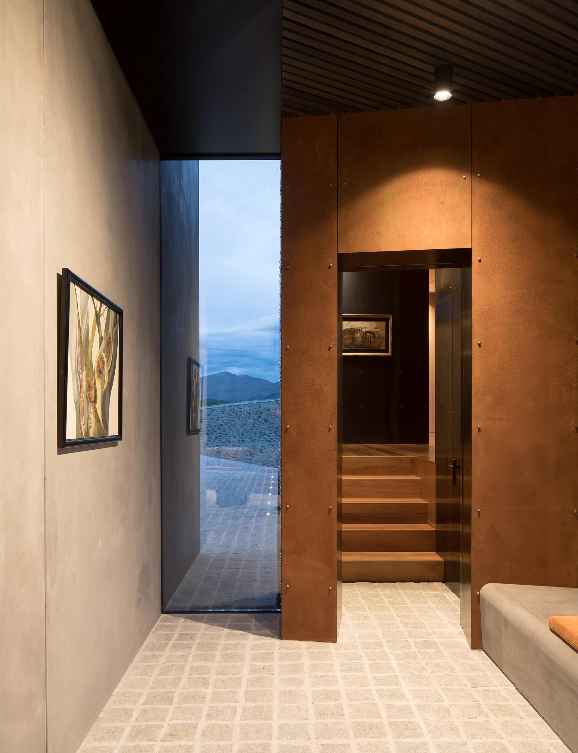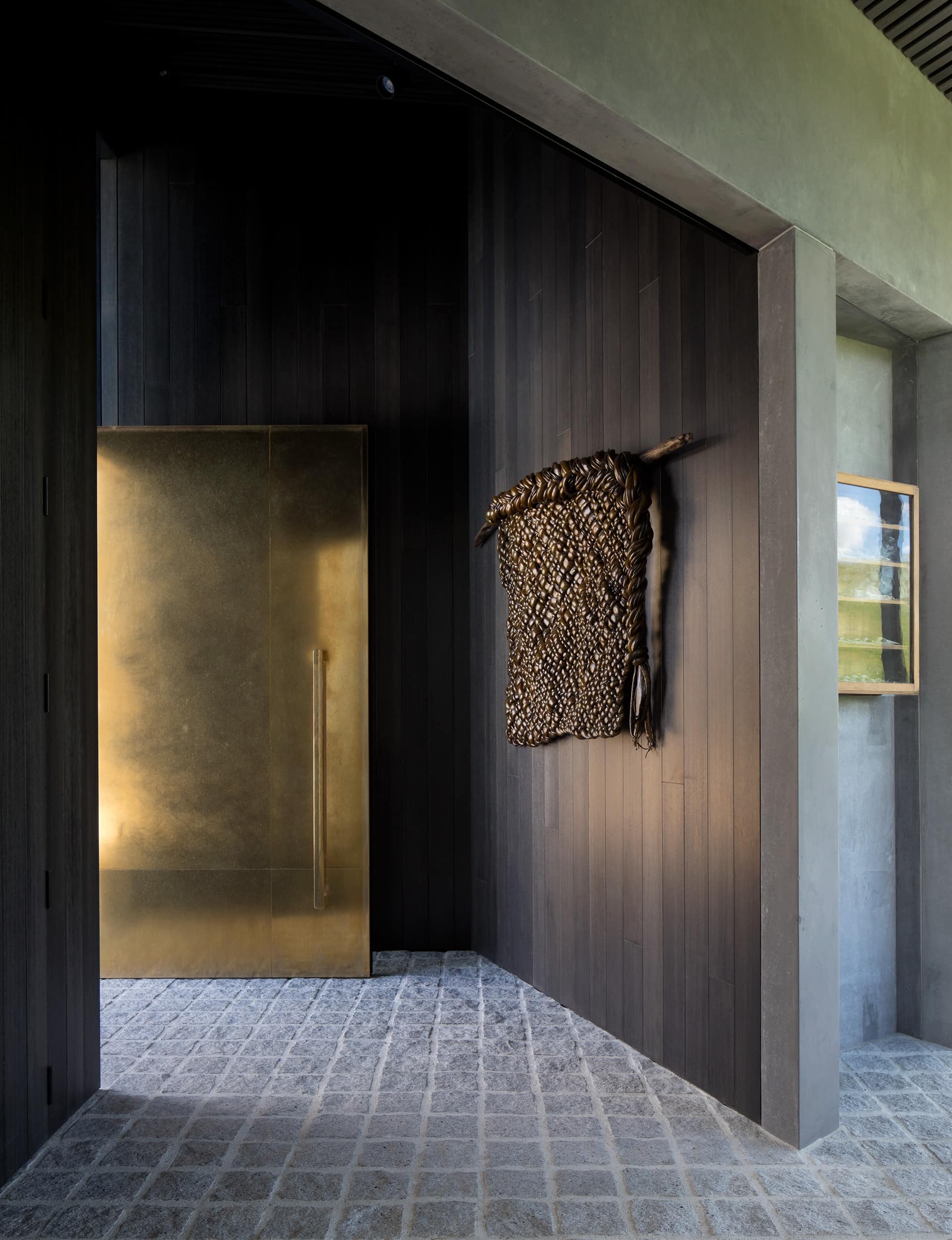 Across the forecourt and past a tree sculpture that takes a determined stride as its arms and hair sweep away with the wind, there is the glint of a bronze front door. Held within a faceted block of concrete, it’s a portal to an interior that celebrates solidity with a vigorous bulk that makes the occupants feel nurtured and safe. “We have a tradition of lightweight buildings in New Zealand, but this is about heavy mass.”