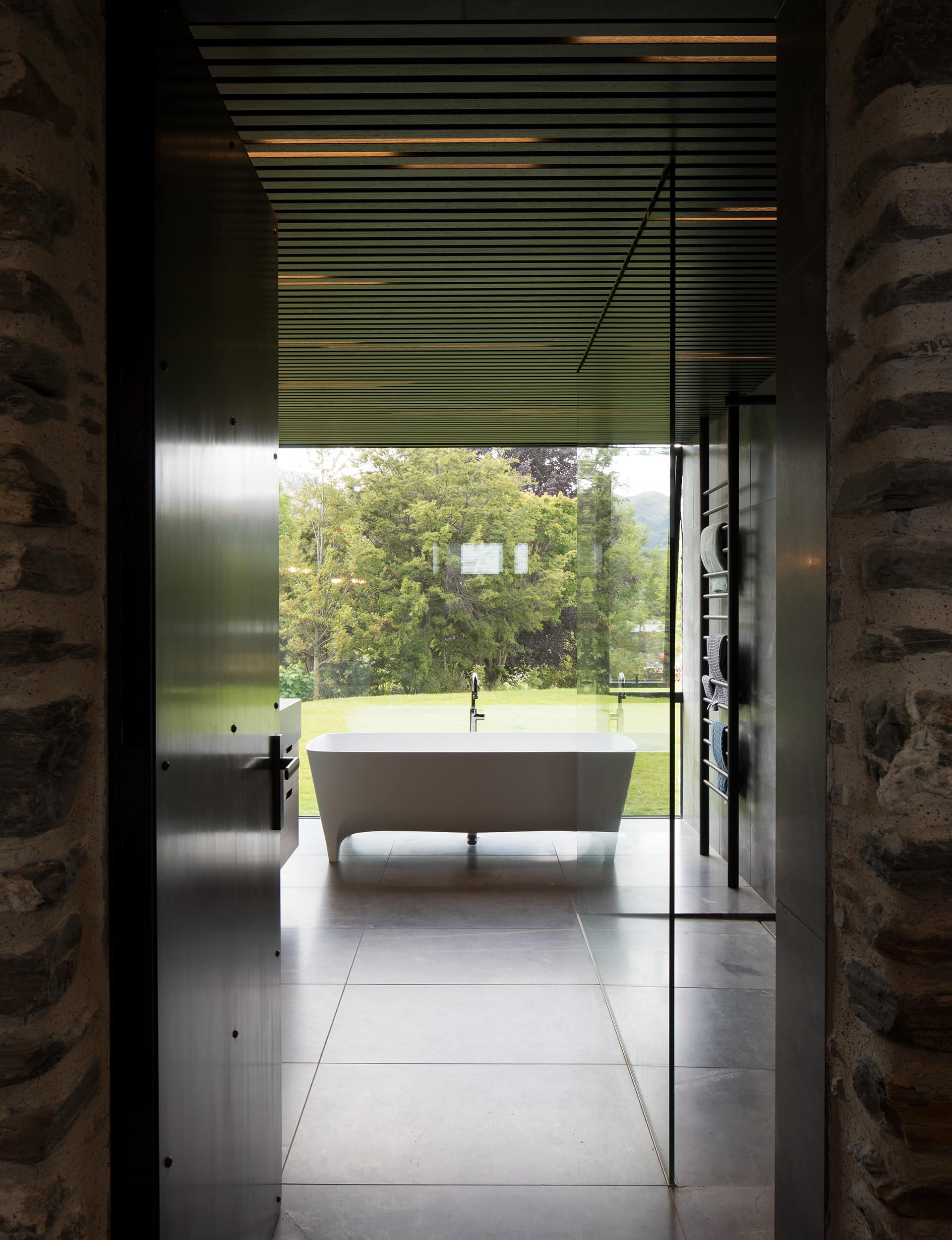 Naish says the design has a very relaxed programme – there is no right or wrong way to move through and explore the spaces. The granite pavers traverse the threshold to a glazed room where a concrete bench-seat is a place to admire a soft mound of green rising just beyond the windows, contrasting it against the strength of the distant powdered peaks. The owners say this is one of their favourite areas – a moment that distils the view.