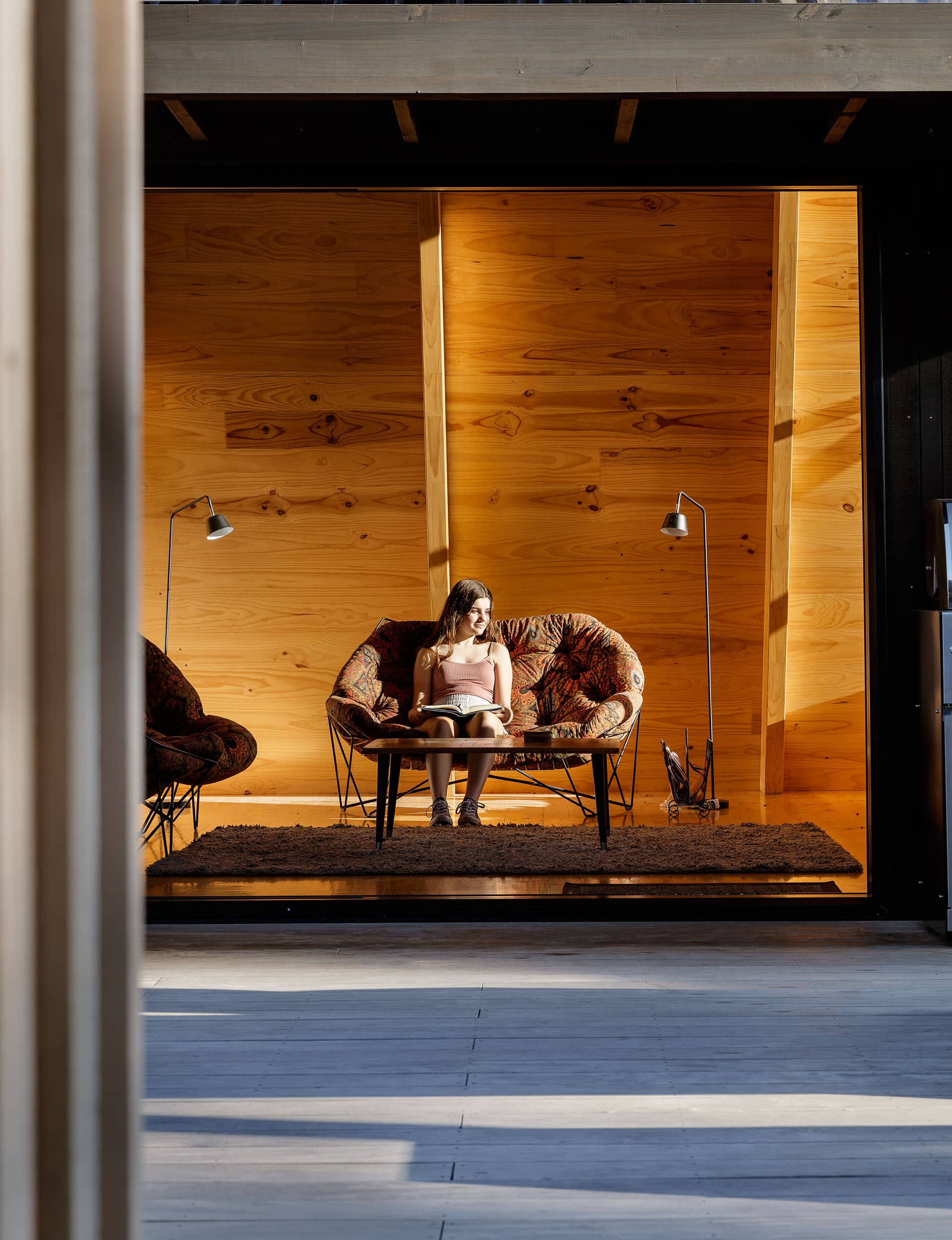 On a cold winter Friday evening we arrive to a space that’s about 11 degrees, but which can be heated in less than 30 minutes. Other than during the darkest winter days, there’s enough mass in the timber interior to keep us comfortable for about a day without having to crank up the fire. The trade-off is that in summer we don’t have the mass to regulate peak temperatures – but that’s what sliding doors are for.