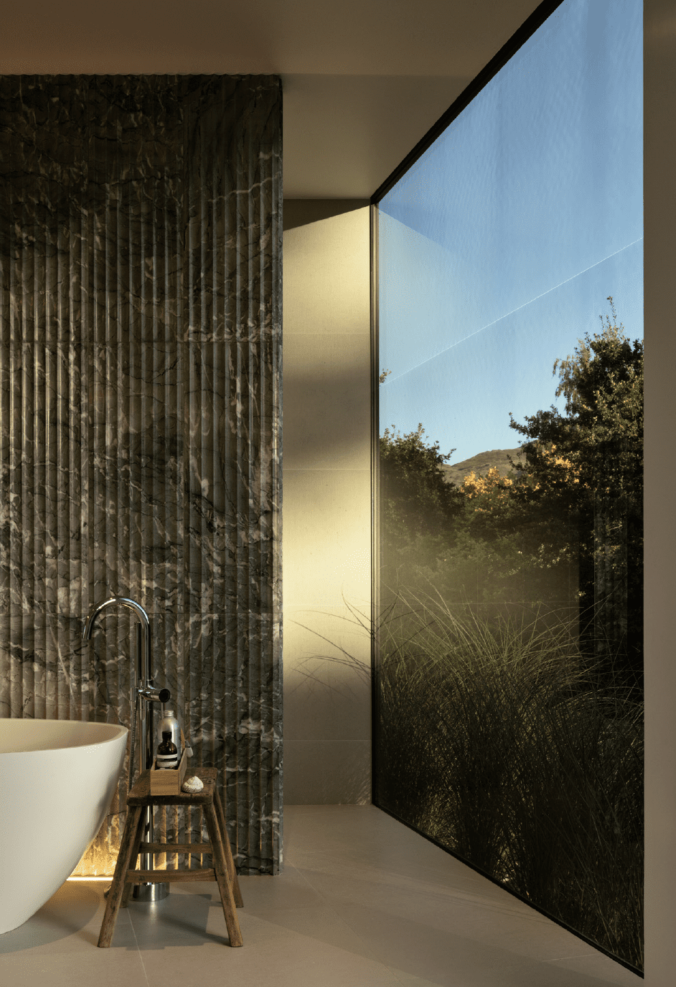 The main bathroom uses a beautiful, scalloped stone — probably the clearest reference back to the nearby cottage with its jagged edges and minerals chiselled by wind and rain. Uplit and with direct, glazed views to the exterior, this striking material seems to morph with shadows and sunlight.