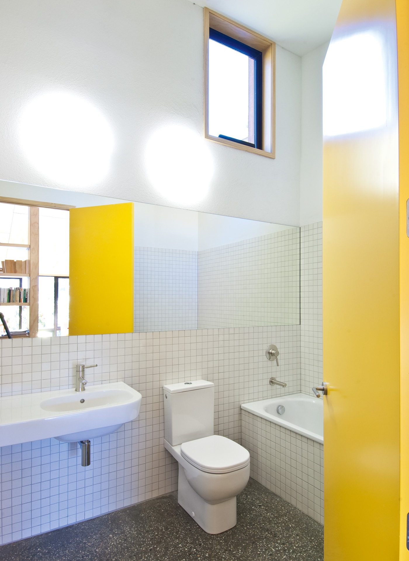 A high stud adds a certain spaciousness to the room, where bath, WC, basin and shower (out the left-hand side of this photograph) are lined up around the walls. Clean white tiles, a long horizontal mirror, and white globular lights complete the simple look – with the assistance of a bold splash of yellow from the bathroom door.