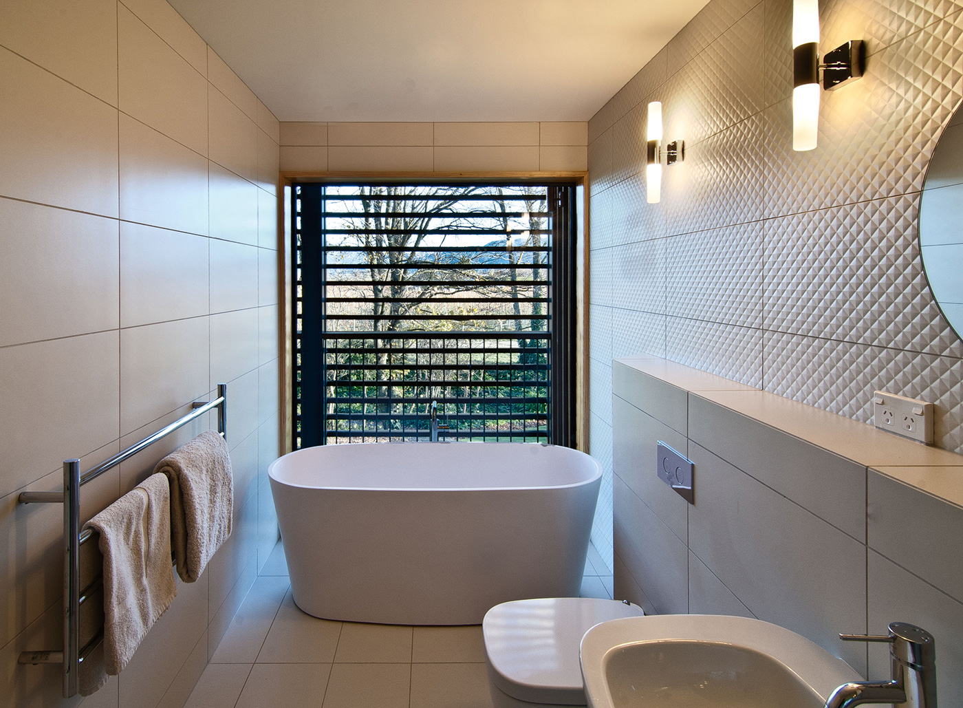Paul Rolfe, Paul Rolfe Architects The building has been designed to funnel in the view of the landscape as much as possible, as the view is very closely linked to Cloudy Bay vineyard’s brand and wine label. We wanted to continue this connection to the landscape and view in the bathrooms by having a full-height window.
