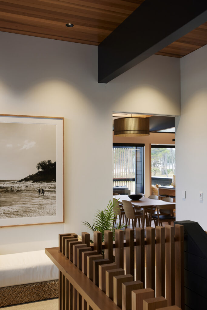 The soffits and ceilings are cedar; the living-room walls are clad in hard-wearing Plytech panels. Black beams and joinery, as well as custom black light fittings, reference the exterior hue. Gordon mentions that the owners worked on the soft furnishings with Trinity Interior Design in Auckland, which was “great at keeping it beachy but bringing in a little bit of colour — duck-egg blue, pinks — to give each room an identity”.