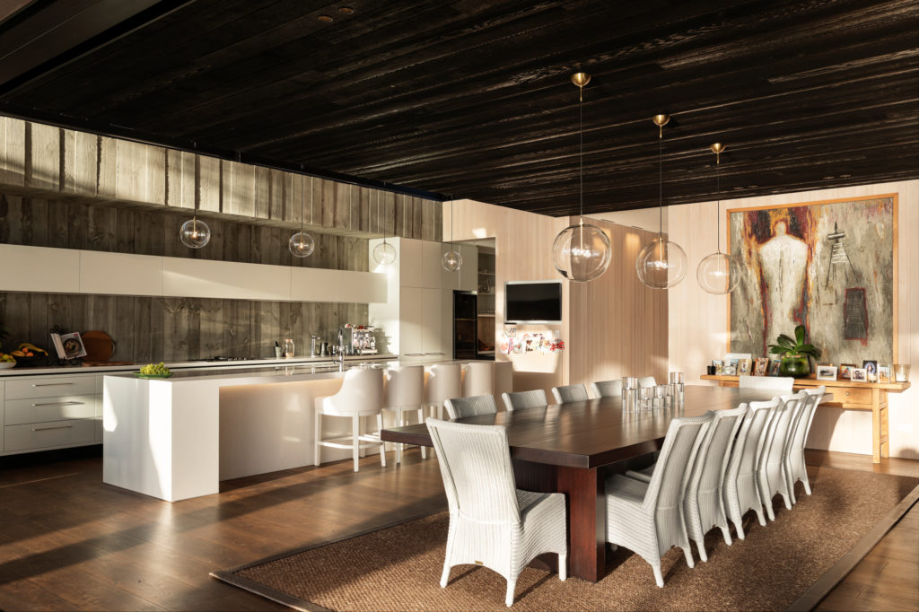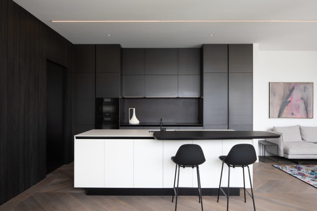 The resulting kitchen is one of high contrasts and textural materials. Black elm, horizontal grain-matched metal lacquer, and light cabinetry with black detailing work in tandem to represent all aspects of the home.