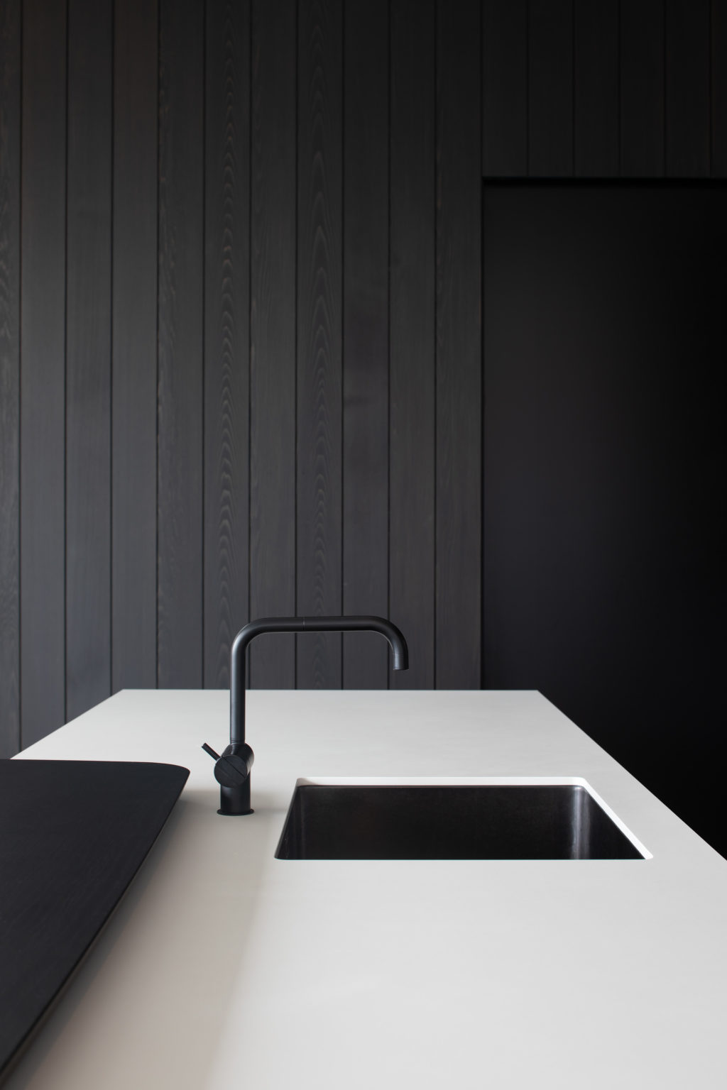 In a play of green and black, stone and timber, the kitchen seems to melt into its surroundings. Matte black cabinetry acts as the backdrop for the emerald green island benchtop.