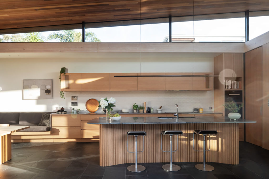 Cool stone tiles ground the warm natural timber used throughout the kitchen, and introduce an airy lightness to the design. Narrow vertical panels on the base of the island break up the width of the kitchen, creating a sense of space and functionality.