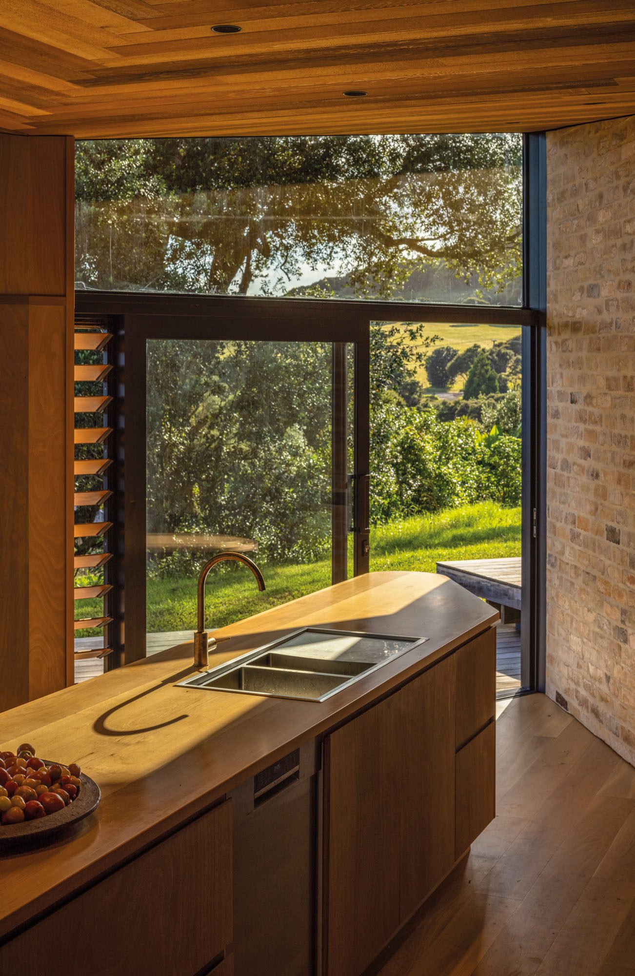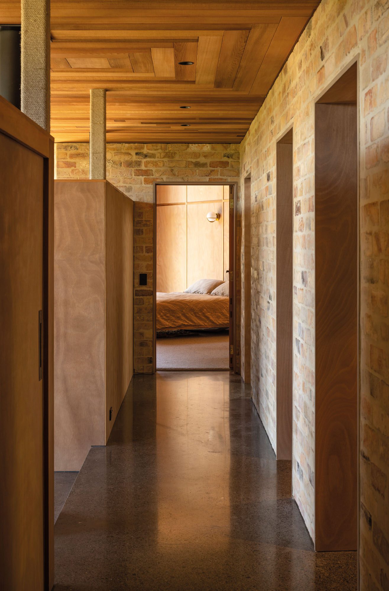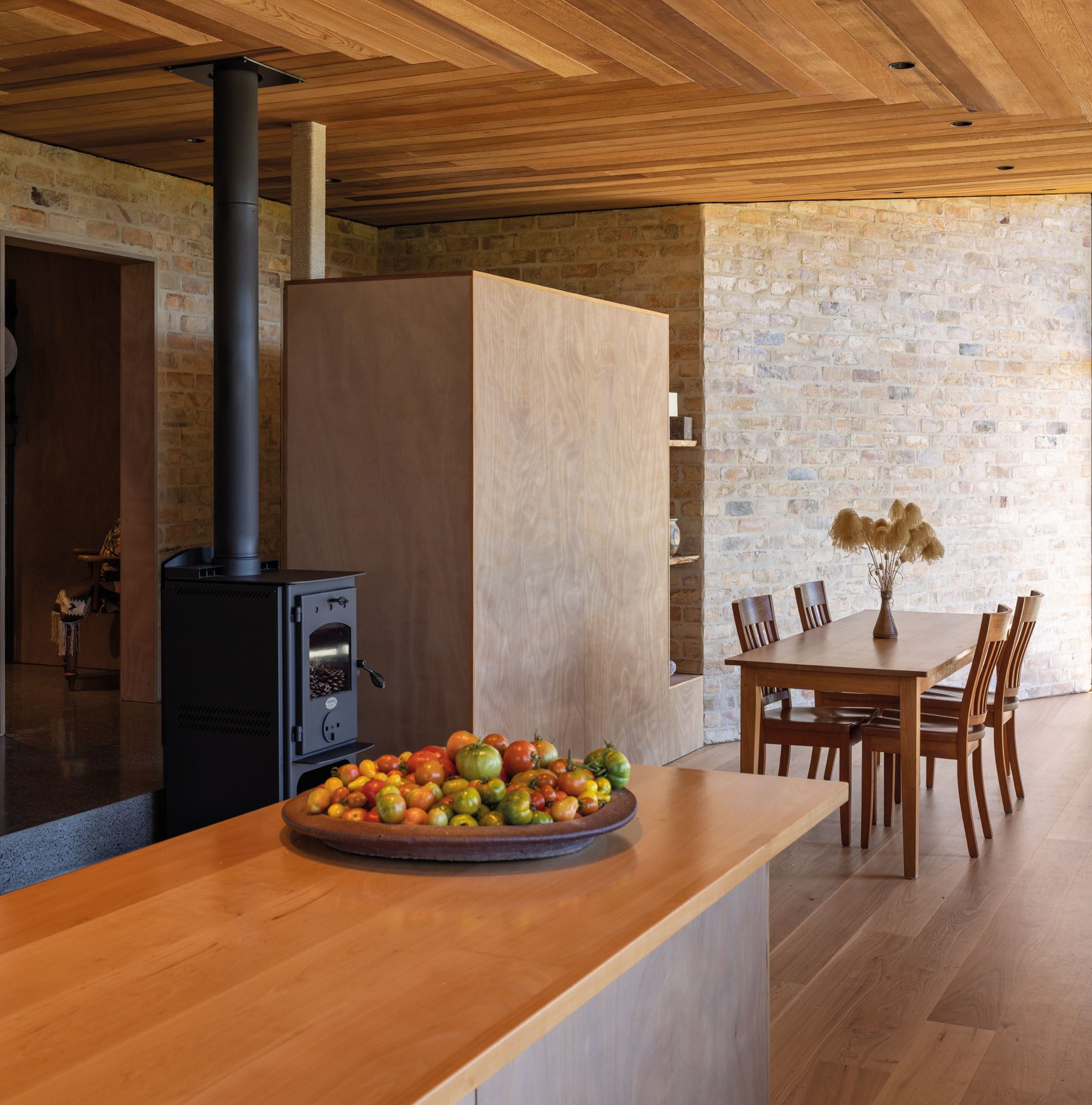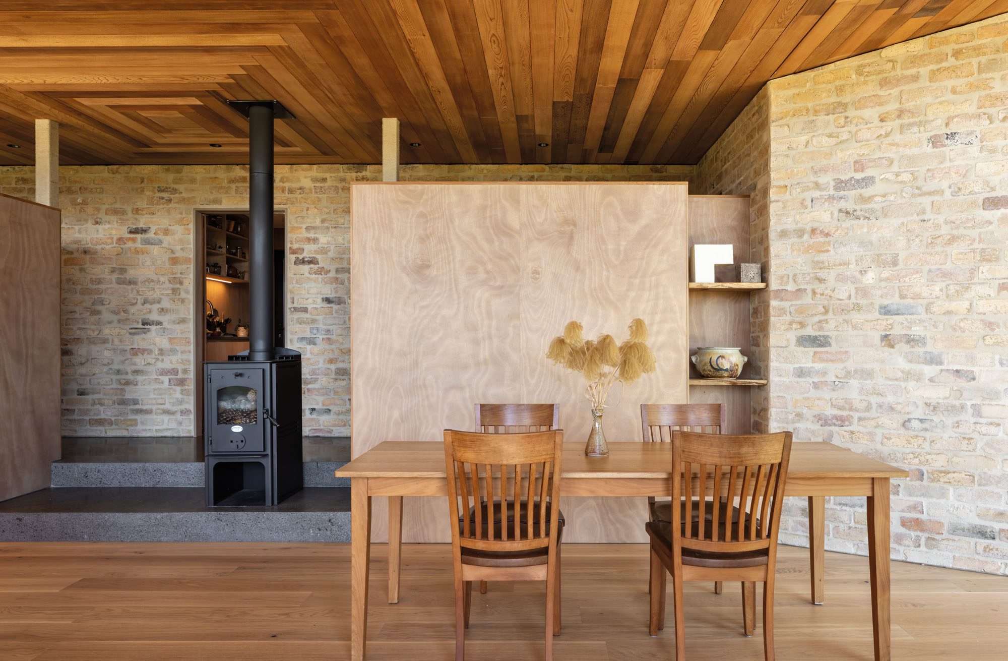 Clad in black fibre cement, the house recedes, allowing the ceiling to command attention, from inside and out. The cedar soffit fans outward in precise strokes — each board a feather, each apex a direction. At the southern point, the timber gives way to a translucent polycarbonate exposing the structure: a tail bone, a moment of intrigue and an invitation. Step beneath it, and you arrive in the mudroom, where reclaimed brick walls are grounding, weathered and storied. Every material inside is influenced by this: the timber floors, cabinetry and benchtop are designed to create a soft synergy around the earthen tones of the brick.