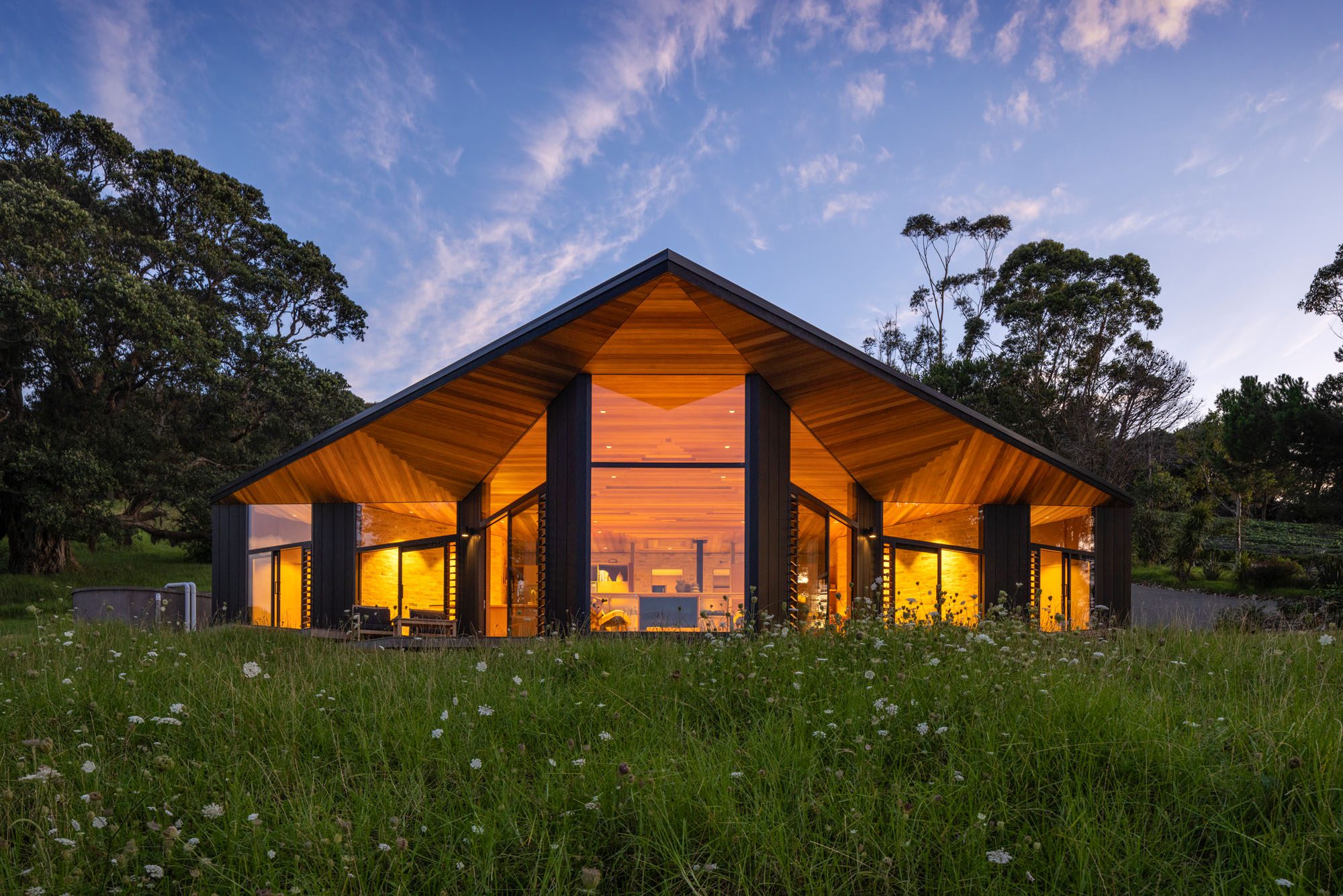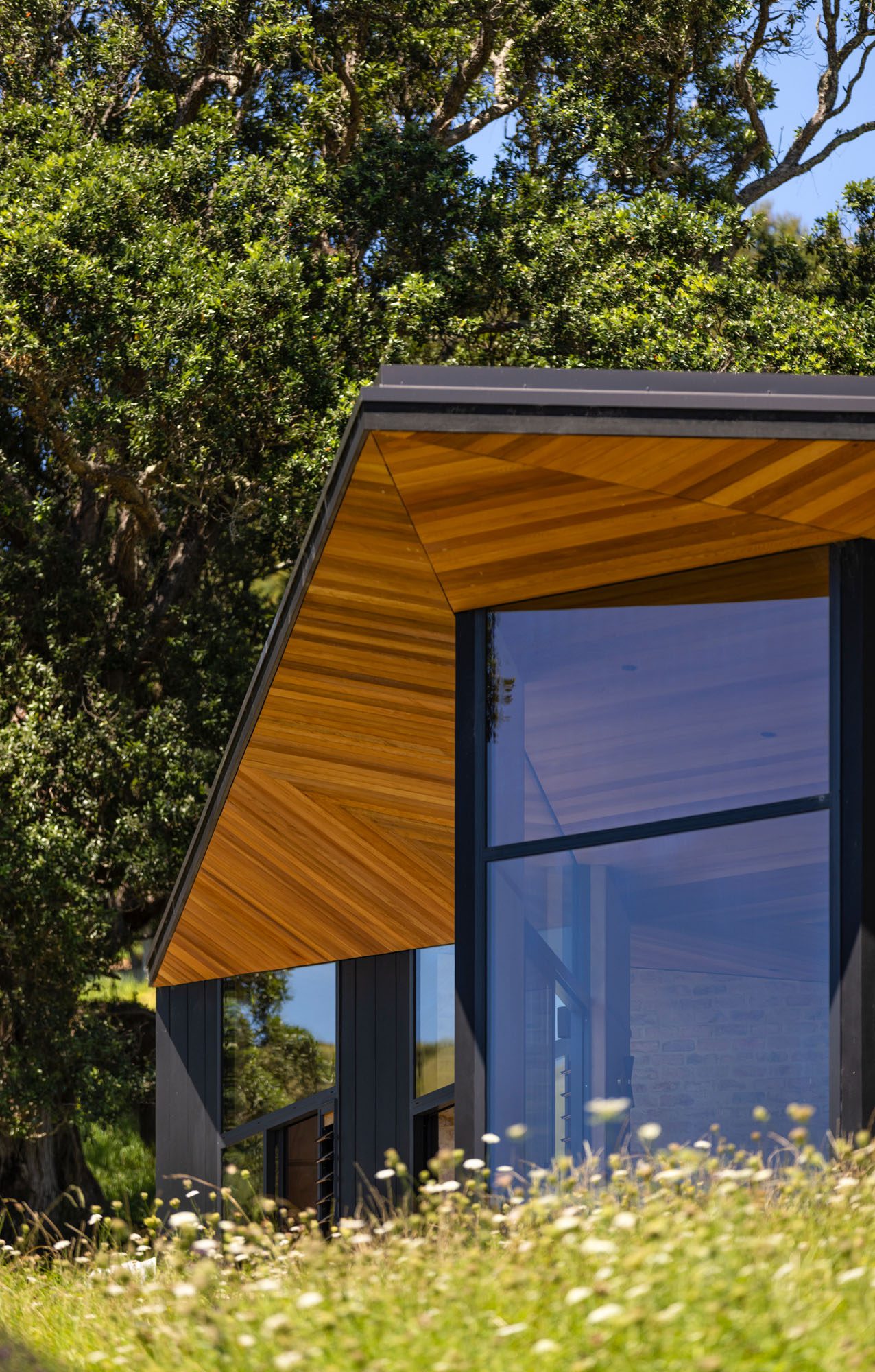 When architect Vaughn McQuarrie first walked around the site, he bent to pick up a fallen pōhutukawa seed pod. In that instinctive, unnoticed moment, a design was born. The pod’s four-pointed shell, opening out to reveal points like a compass, echoed the clients’ wish: a house that might somehow resemble a bird in flight.