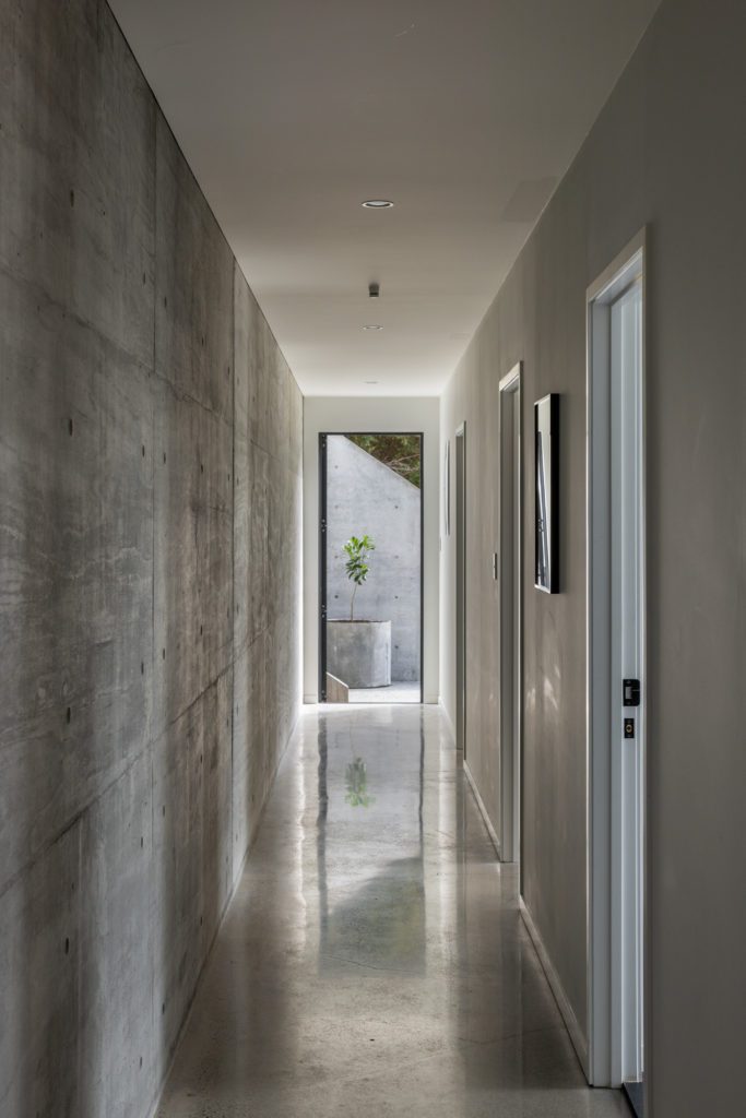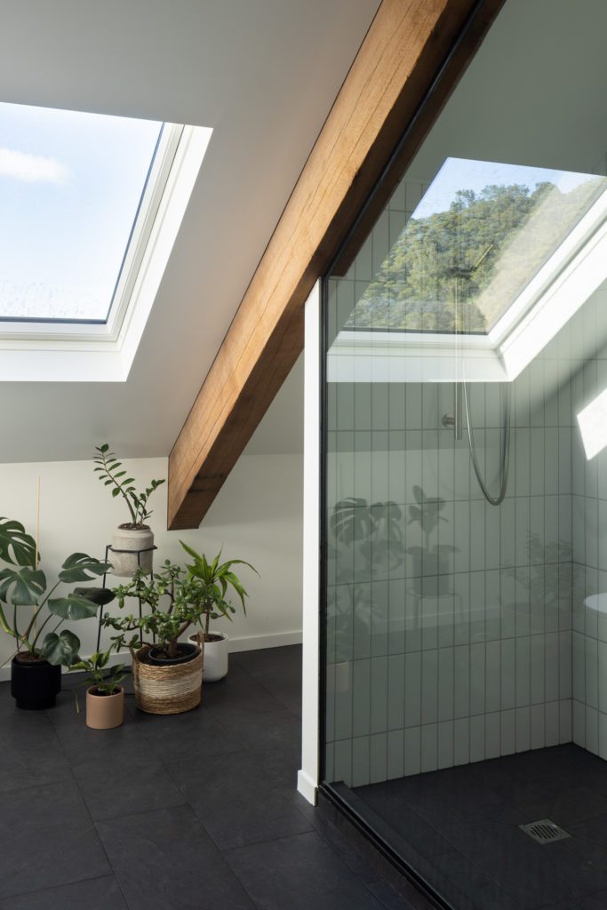 Here, that simplicity unfolds with a restrained palette of materials. To the exterior, concrete and steel; inside, the structure is exposed — timber set against warm white walls that, as Toby explains it, “seem to disappear on a foggy morning, as if you’re sitting in the forest with a cup of coffee. There’s a sense of being within nature, rather than apart from it.” A polished concrete floor on the lower level accentuates the raw simplicity and adds another dimension to the textural in situ concrete wall. To the west, tucked behind the kitchen, are two bedrooms; upstairs, a further two — with skylights drawing light in from above.