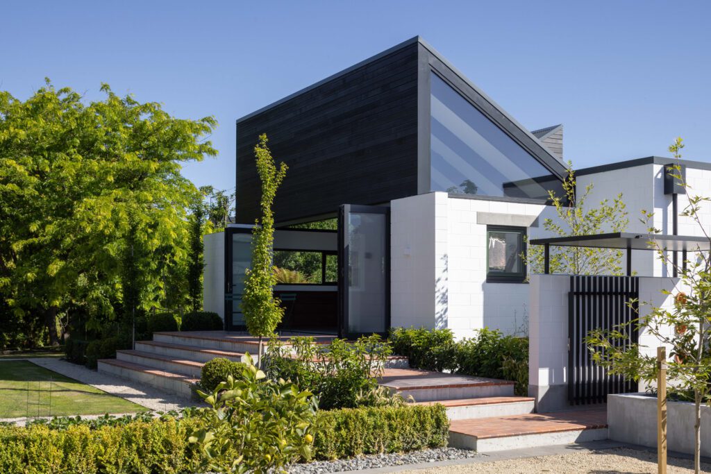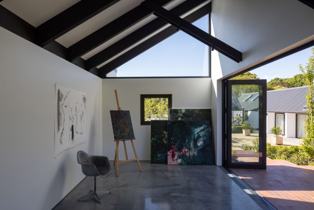 Another imperative for the annex was connecting it to the nature around it. As it is sited on a newly acquired piece of land that abuts Waimairi Stream, the owners were keen to emphasise the visual and physical connection to the water and trees. “It was about framing views or blocking any visual noise from the neighbours,” says Phil, “so that, when you are in the studio, you’re looking out on nature, or getting glimpses of the sky or back to the house or out to the lawn.”