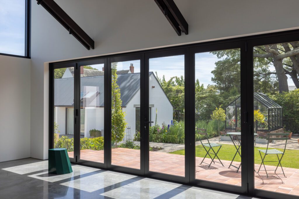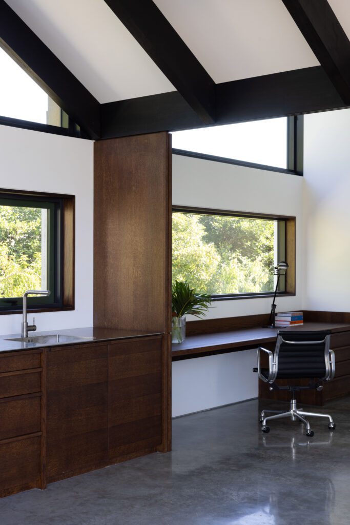 The studio has been raised a little in relation to the rest of the property, with a series of terracotta-coloured tiles lining the stairs that lead from the courtyard to its glazed aperture. On the river side, the studio has been given a true Warren treatment: a butterfly roof with significant allusions to Warren’s College House chapel, built in the 1960s.