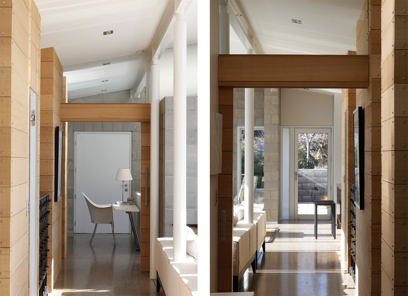 Most importantly, they added large expanses of glass to the home’s northern side, creating a floor-to-ceiling view of the mountains across the valley. “I thought, what’s the point of living there if you can’t see the mountains?” Simon says. The home’s eaves keep out the harsh summer sun, but the windows allow the house to be filled with light and warmth in winter. (You can see in these photographs how deeply the sun reaches into the living spaces through the new windows, allowing the terrazzo floors to hold its warmth and release it through the evening).