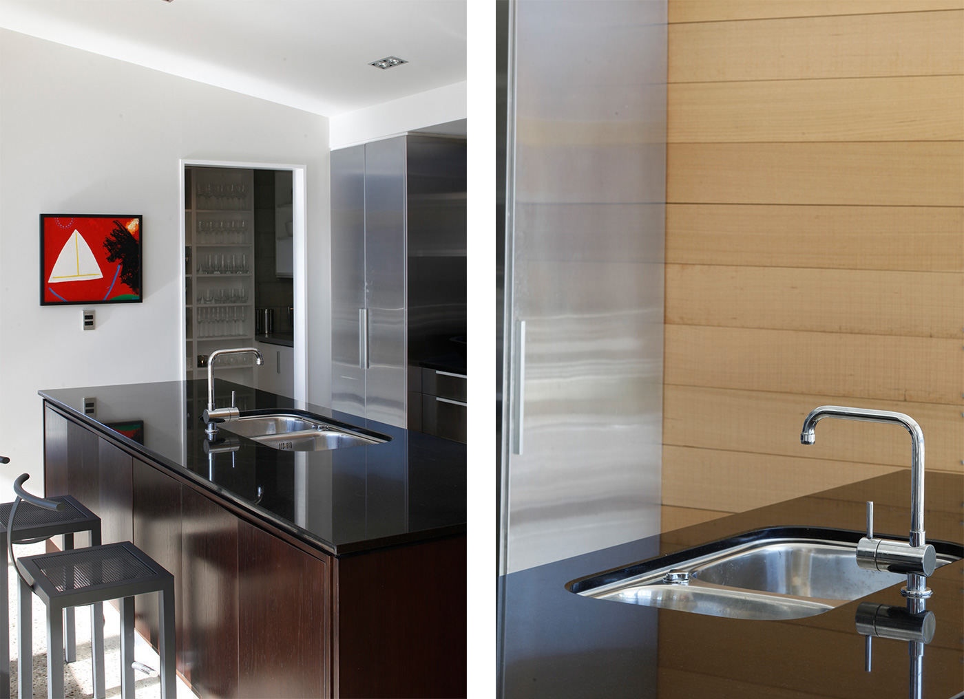 The living area features four ‘Lifewood’ sofas by Antonio Citterio with casual fabric covers. There are also beautiful works by New Zealand artists including Gretchen Albrecht, Paul Dibble and Robert Ellis.