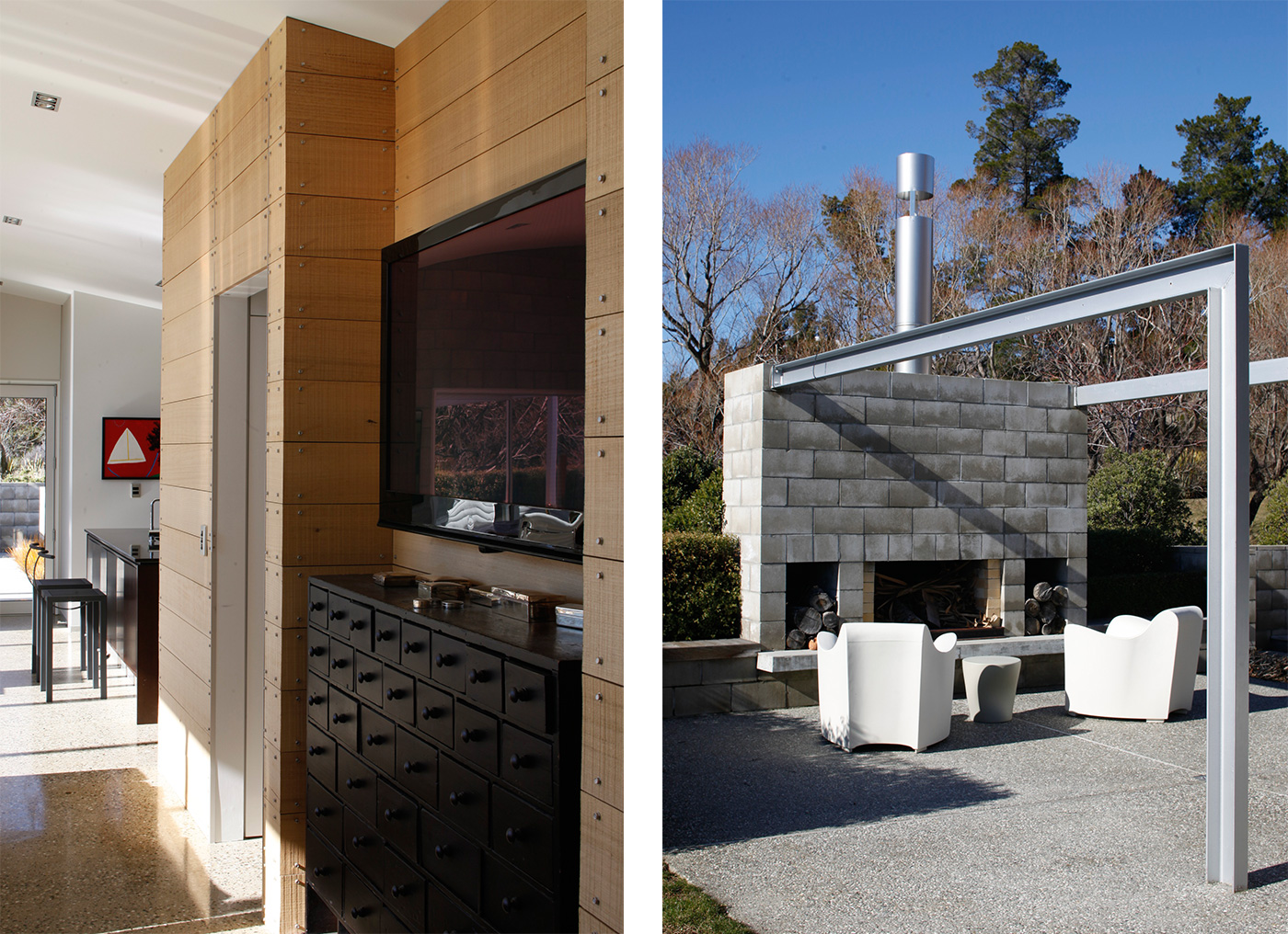 Where the cool sheen of metal and glass predominated in Simon and Robyn’s Auckland home, they stripped back the plasterboard inside the Gibbston Valley house to showcase its raw concrete blocks, and warmed the mood of the space by installing a long wall of southern beech boards studded with small bolts. The doors and wall were clad with the same timber, and meld with it almost seamlessly when they’re closed. An antique Irish apothecary cabinet – the sort of old-fashioned indulgence they would never have permitted in their Auckland home – occupies one wall.