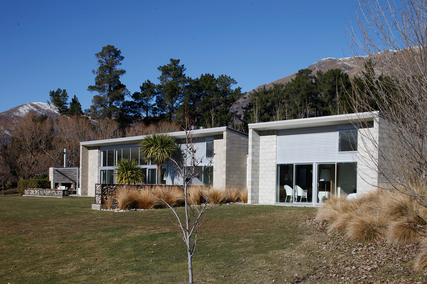 Outside, they focused on integrating the house into the beautiful landscape around it. They built gabion walls to extend the lines of the house into the property. They planted tussock and a number of new trees to soften the edges of the property. They created two sheltered courtyards – one on the home’s northeasterly side, and the other tucked between the house and the garage – where they could gather the outdoor fireplaces in the evening and gaze at the mountains and the stars.