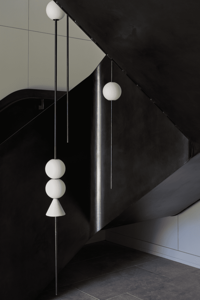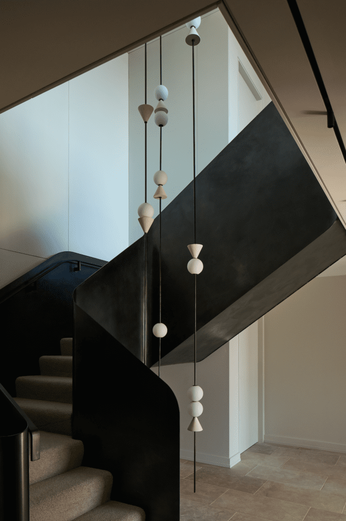 “The pendant’s presence is further elevated by its placement within the blackened steel stair, which was designed by W2 Architects and fabricated by Hall Fabrication. The staircase, with its 6mm thick steel construction and matching Midnight Brass patina, forms a cohesive and captivating interplay with the pendant, marrying function and artistry in a truly unique way.”