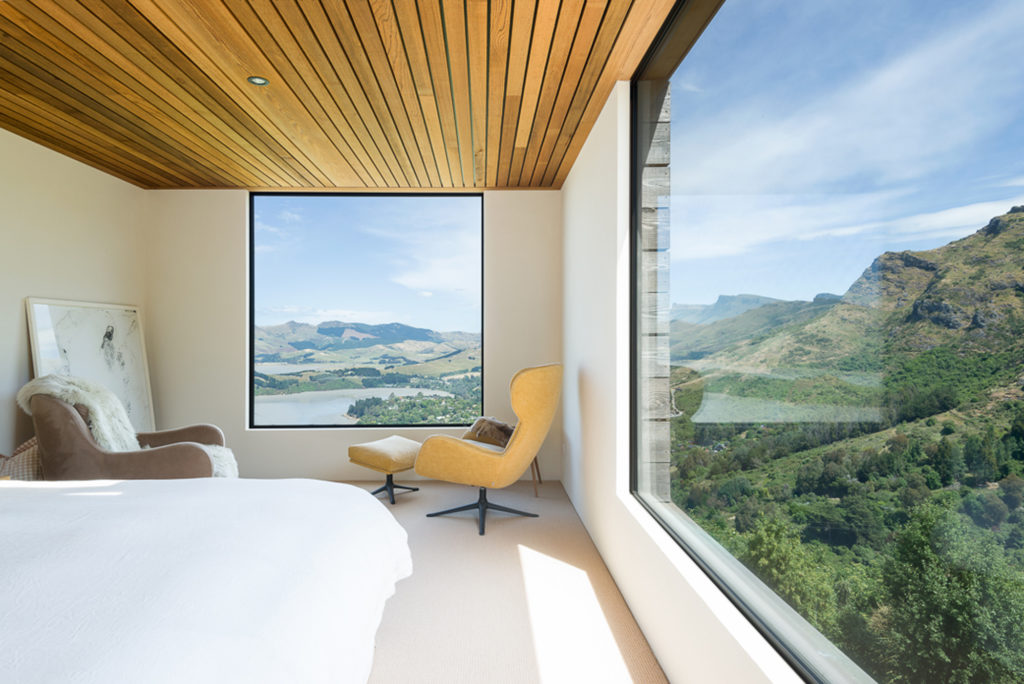 “The clients had different visions for what they wanted in this house; the husband is a car enthusiast and that meant we needed three garages. The wife, who devotes herself to the land — and is working on a public cycleway down to Governors Bay that runs through their site — wanted a studio-cum-sanctuary where she could sit by the fire and retreat,” Philip explains.
