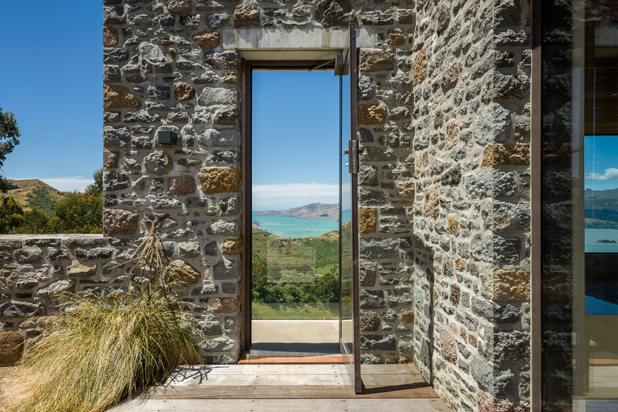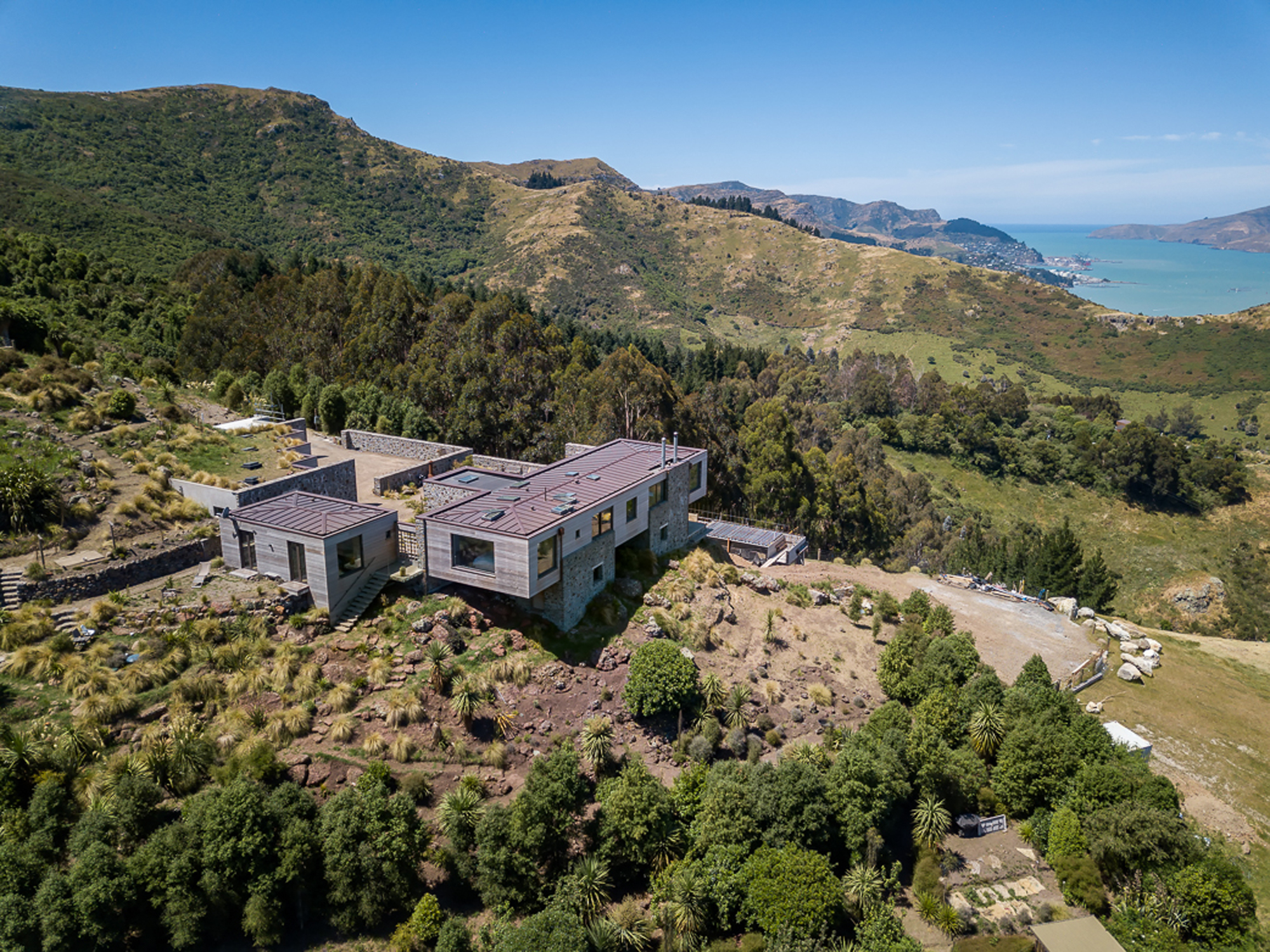 This house — somewhat Mediterranean, somewhat Japanese in influence — extends around a compressed dirt courtyard high in the Port Hills overlooking Governors Bay.