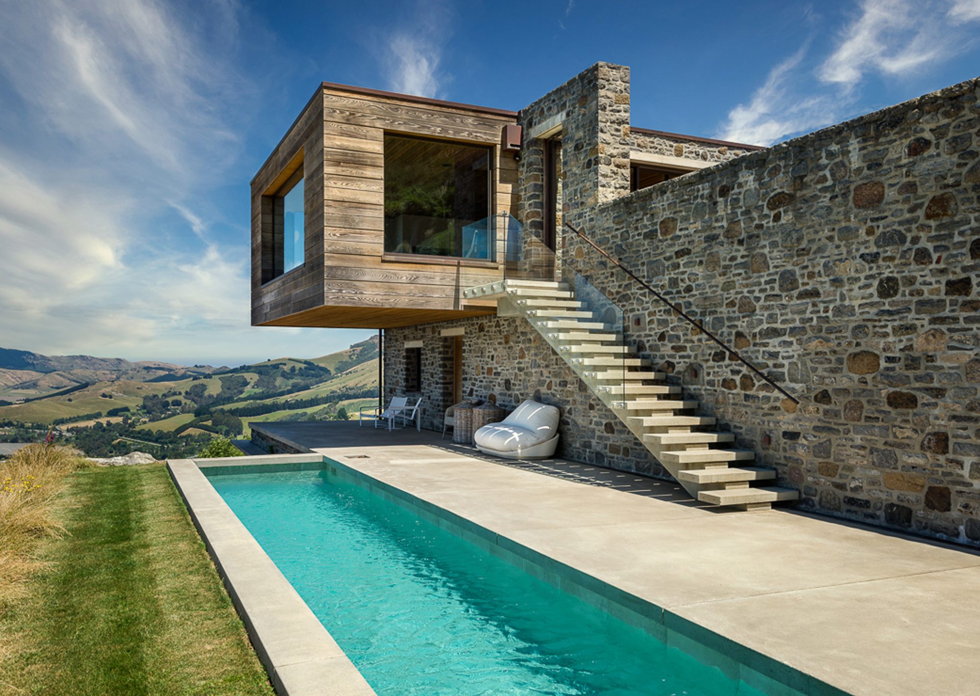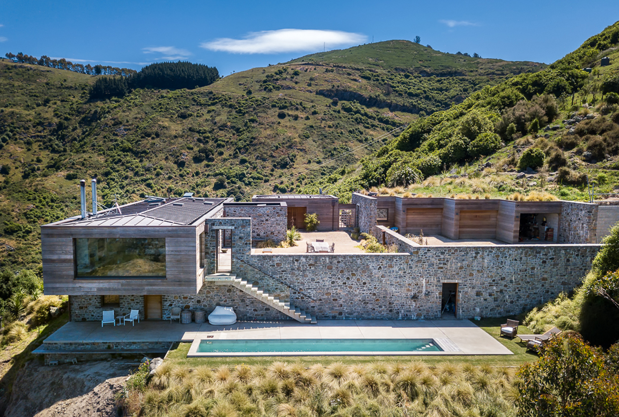 Clad in red and brown volcanic rock excavated from the site, it has a distinctly Mediterranean feel about it, but the stone is juxtaposed with thick horizontal cedar, extensive glazing, and highly engineered cantilevering of the upper storey — together offering a simplicity akin to Japanese architecture.