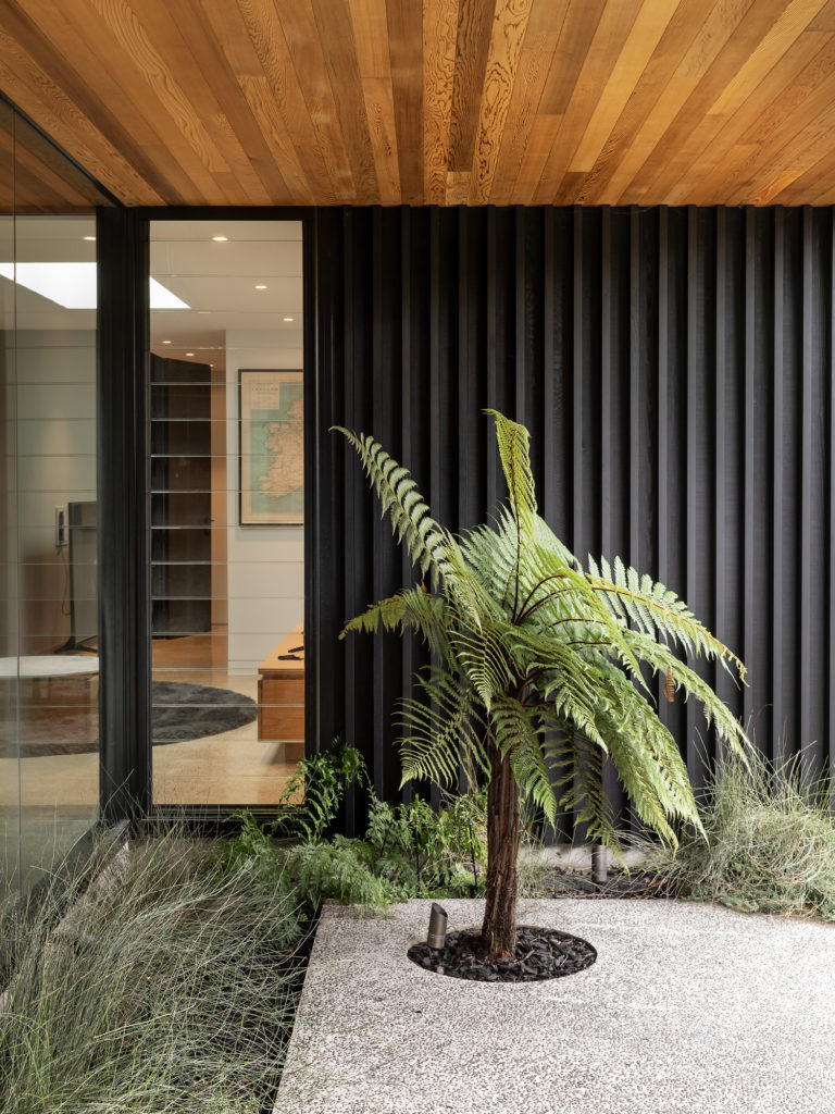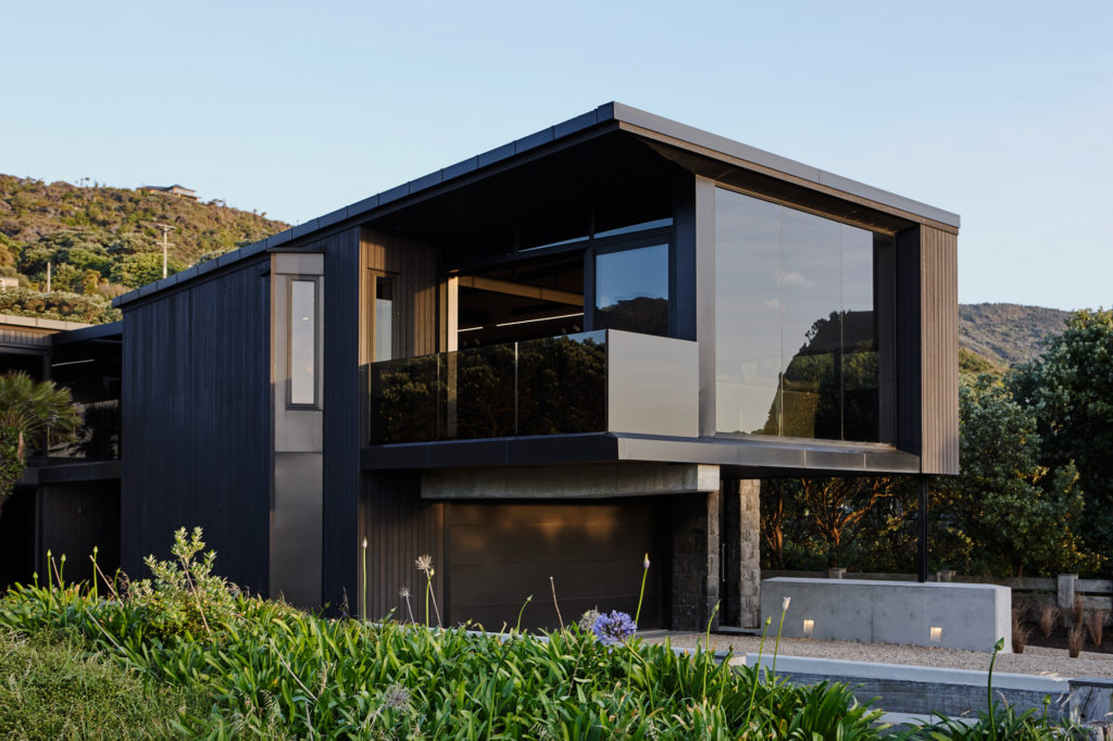 Concealed on a bush-clad hillside site above Piha, the dark facade of this home mimics the tones of the ironsand on the beach below.