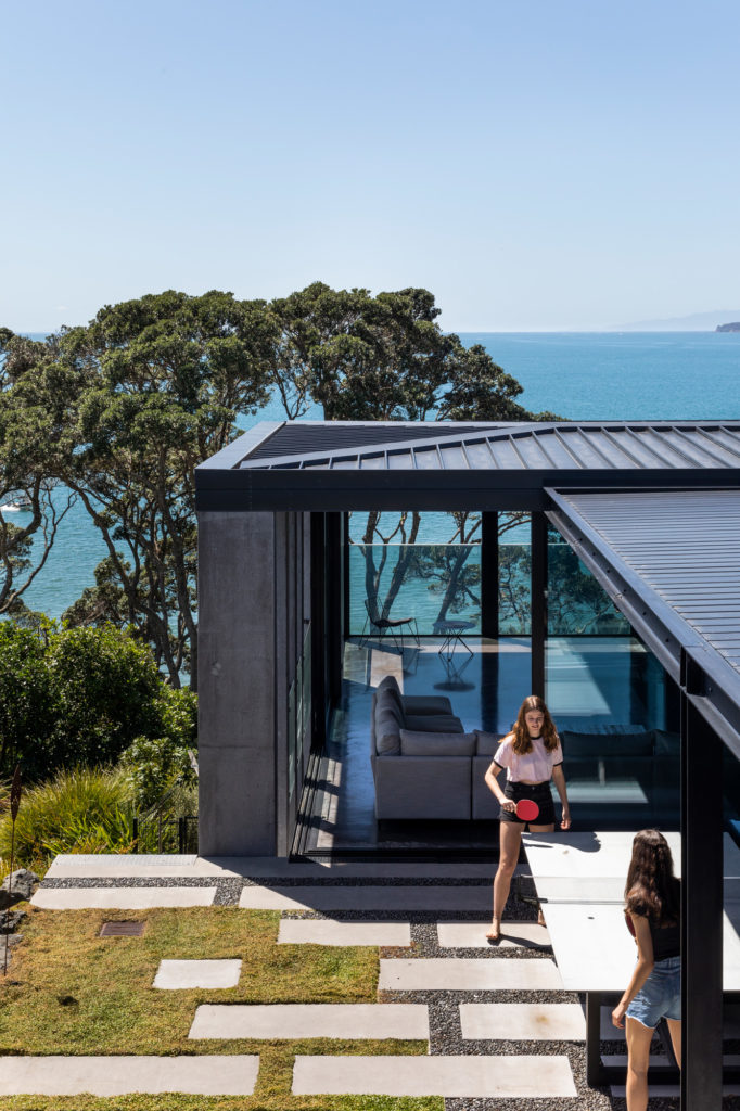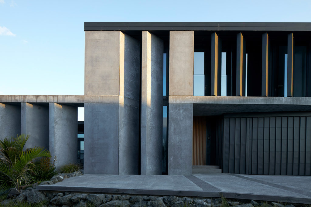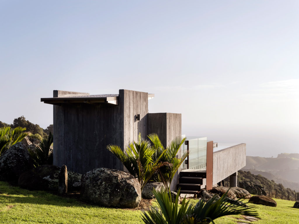 Perched on a cliff above Red Beach in Whangaparoa, this house of blackened concrete and waxed steel delivers an unexpected lightness of form.