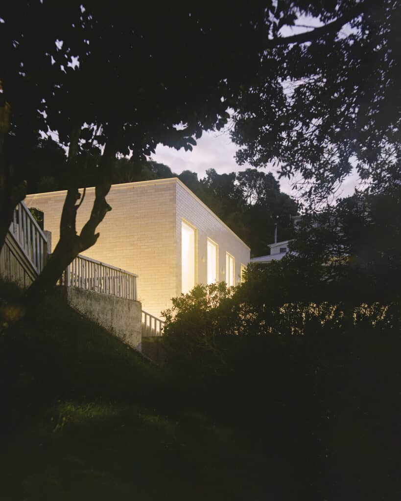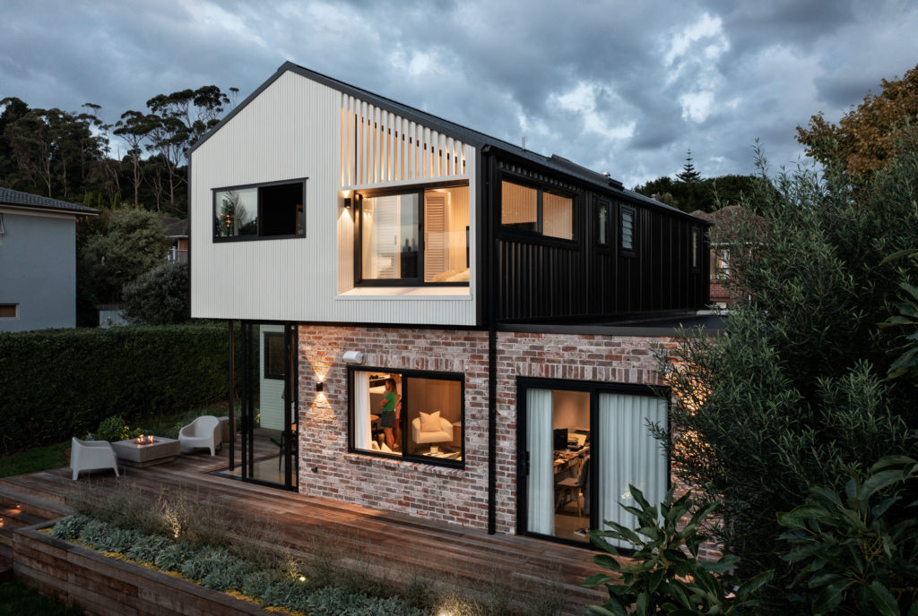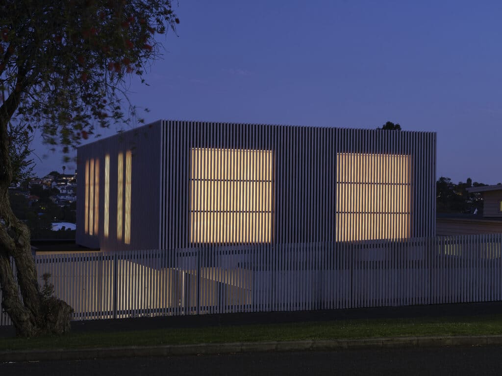 This Auckland home is made up of a trio of individual but allied cubic forms using terracotta, corrugate, and a polycarbonate that positively glows in the dark like an urban lantern.