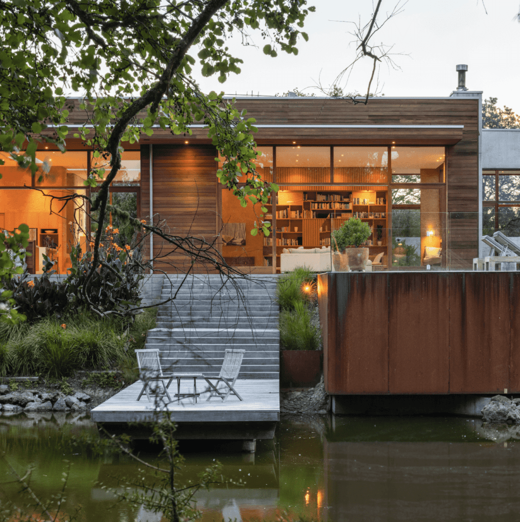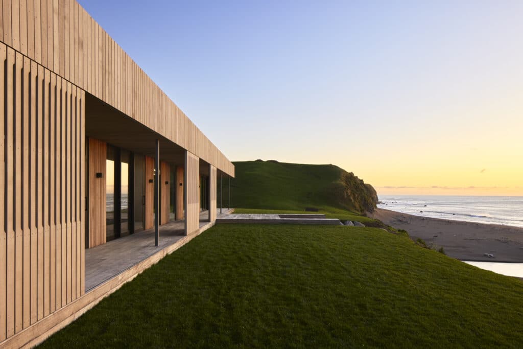 Architect Brady Gibbons expertly incorporated the key elements of the coast, a winding stream, and the need for shelter from the harsh climate into the design of this home. The vertical cedar cladding, combined with sliding screens, gives the house its unique exterior character.