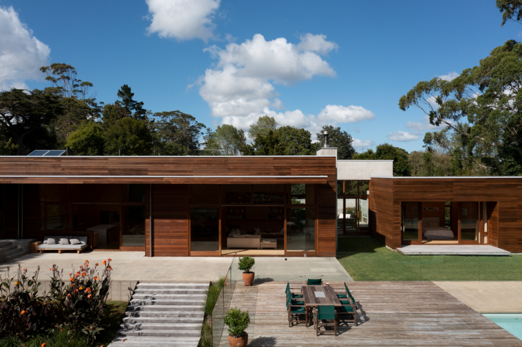 In the foothills of Karioi, dark cedar cloaks a home surrounded by lush greenery in a vast and encompassing landscape.