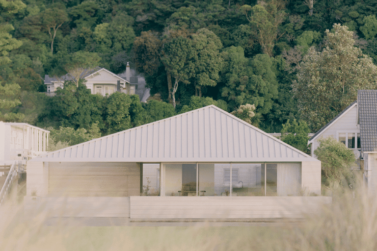 Appearing to both float above and disappear into the land, this Tāwharanui holiday home is a place of tension and beauty.