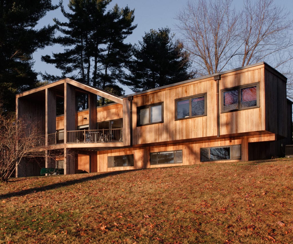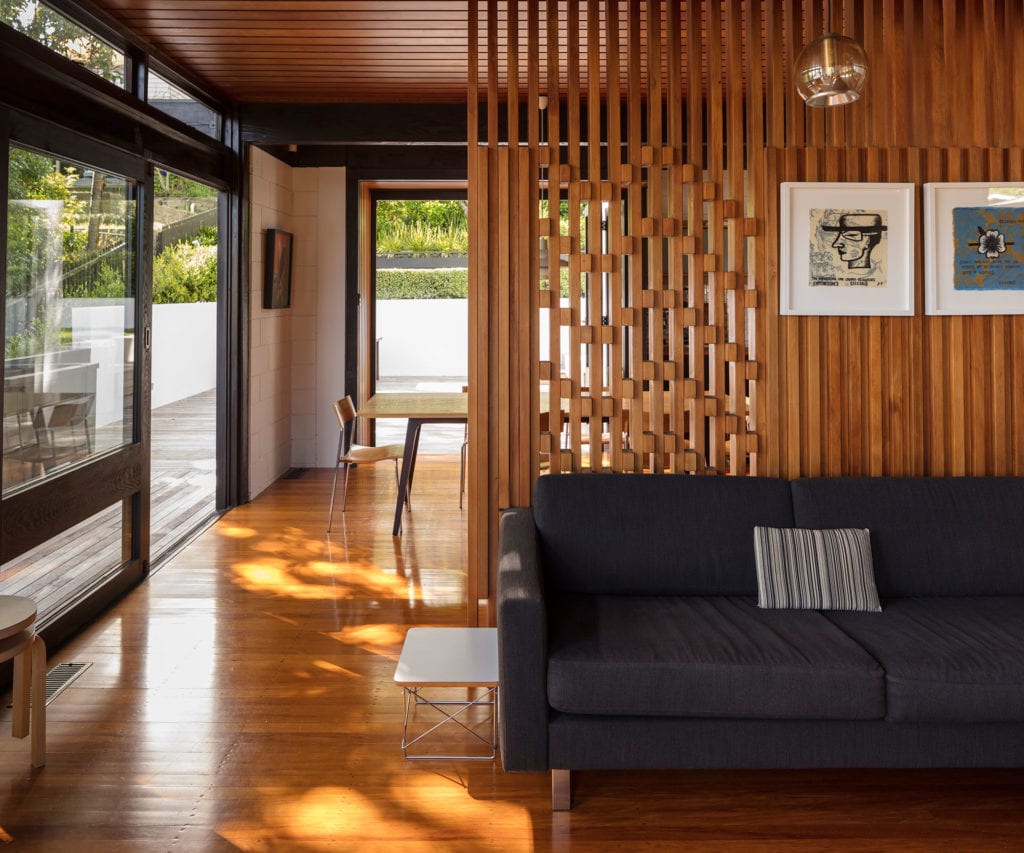 Cantilevering dramatically towards the water, this design defies the constraints of a steep site, anchoring the heart of the home to the land.