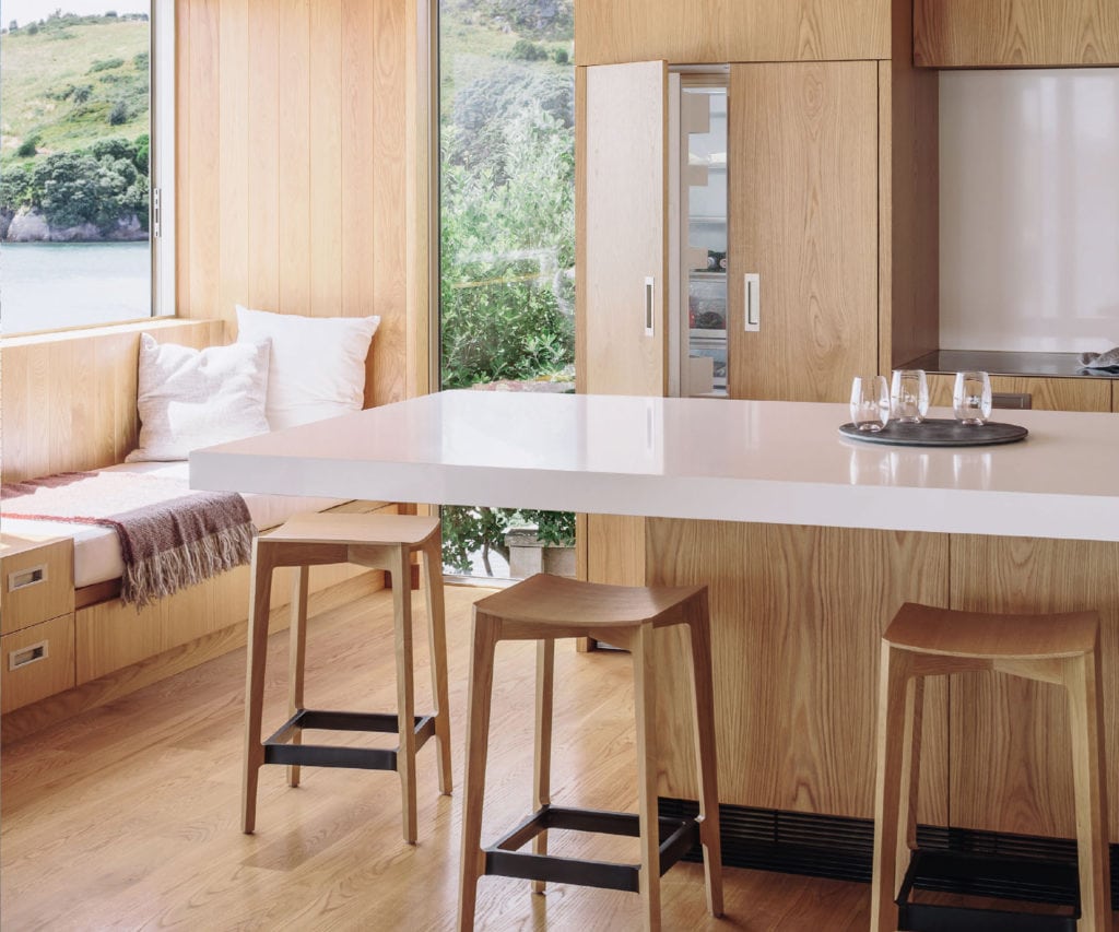 On a rugged, bush-covered site on Waiheke’s east coast, Chris Tate envisaged a floating pavilion — crisp and minimal; an expression of geometric clarity; a vehicle for relaxation, at one with the land and the sea.