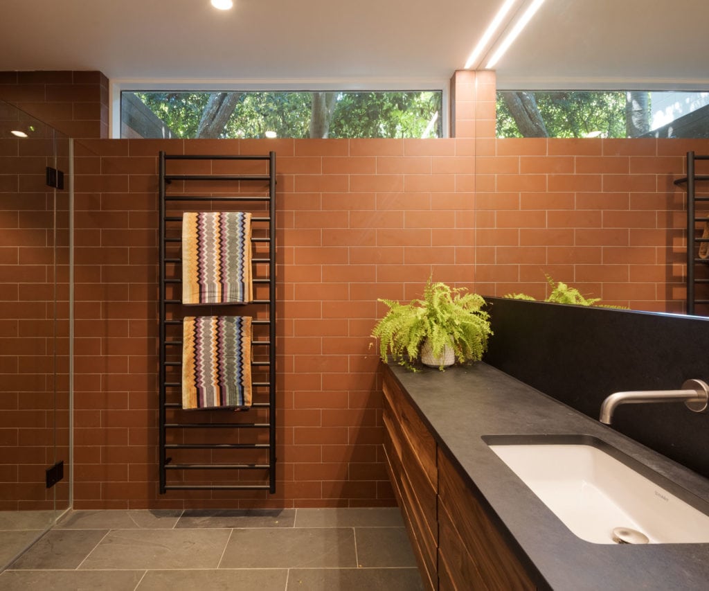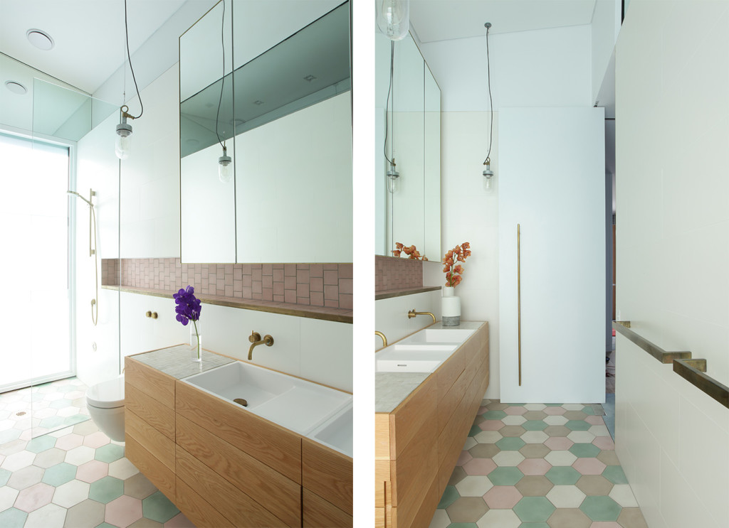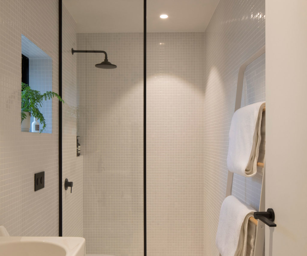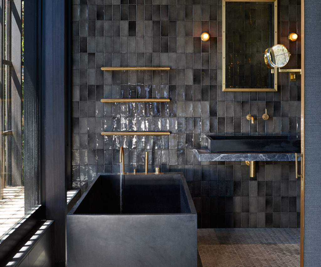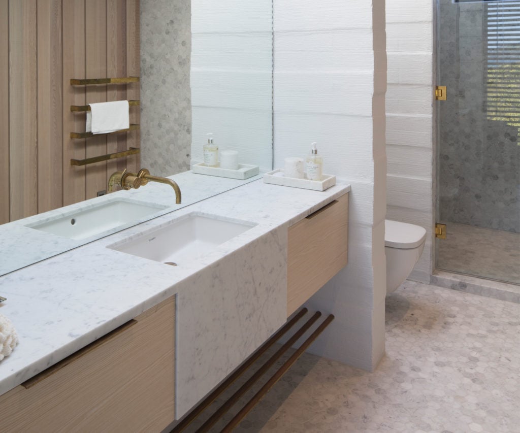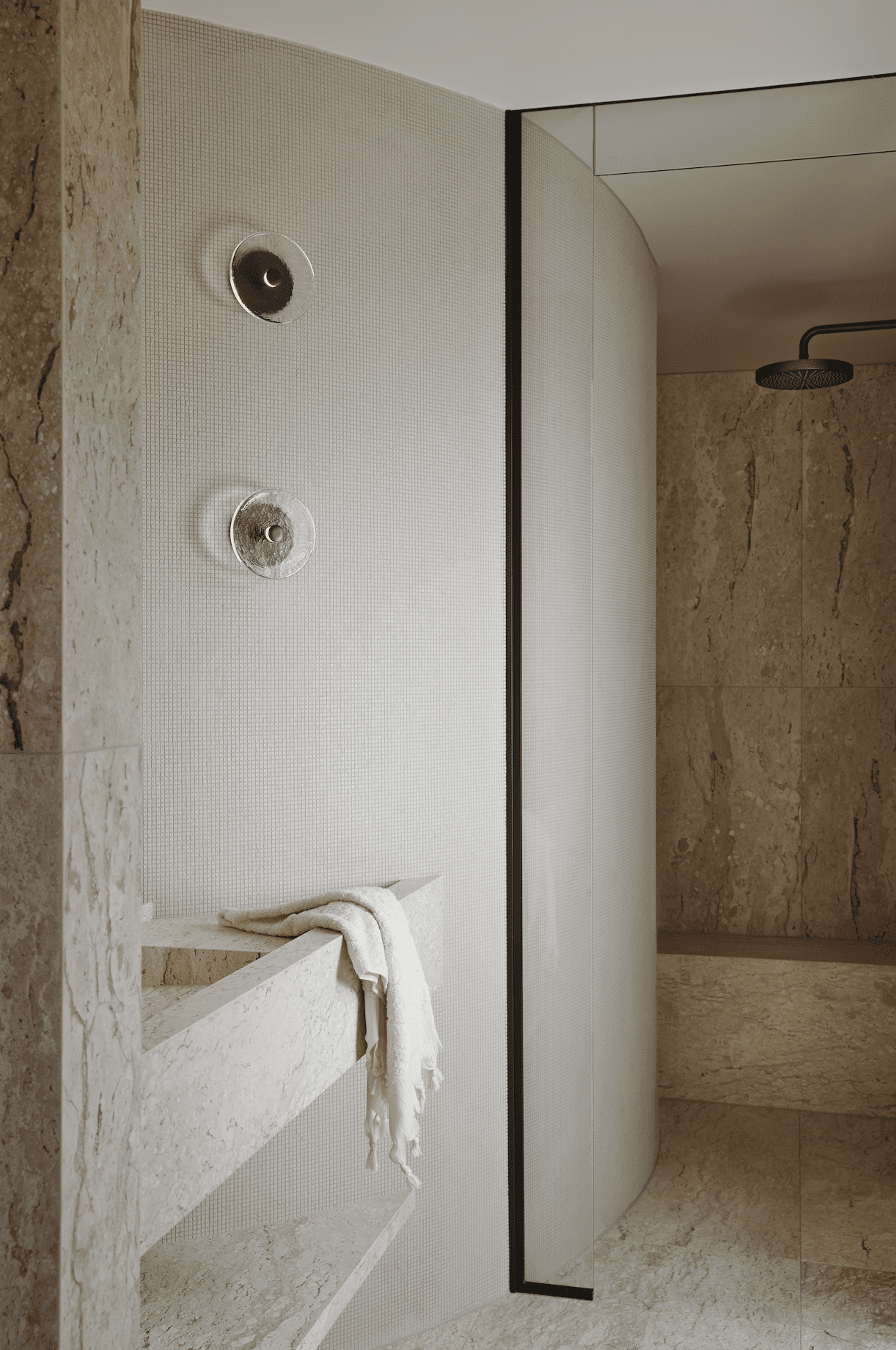 In a villa renovation by Jones Architects, interior firm Sticks+Stones Design crafted a small, unassuming en suite that packs a big punch.
