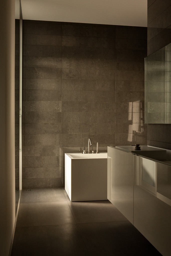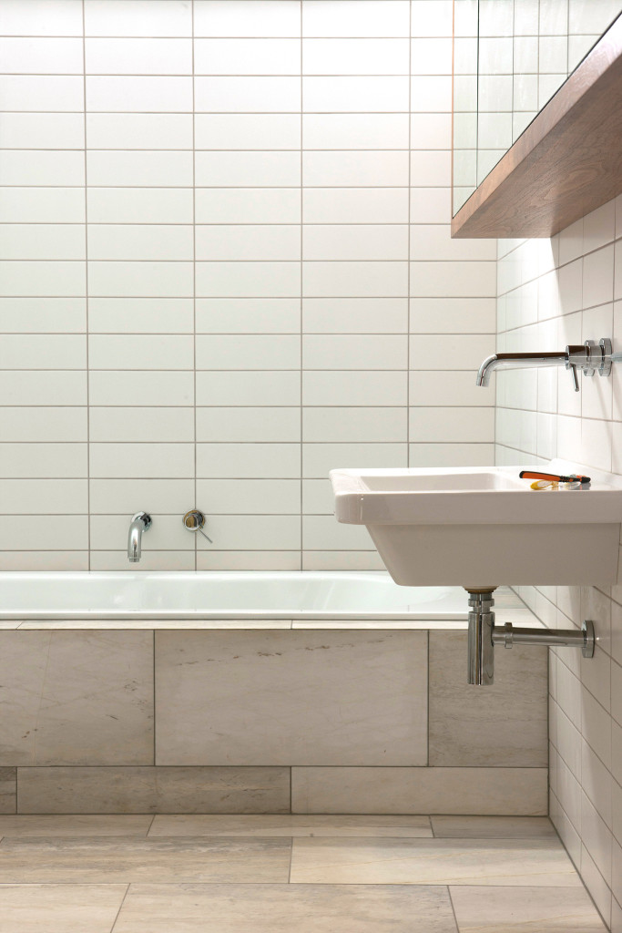 In this doorless bathroom, light is drawn in from above and a trio of materials is used in unexpected ways.