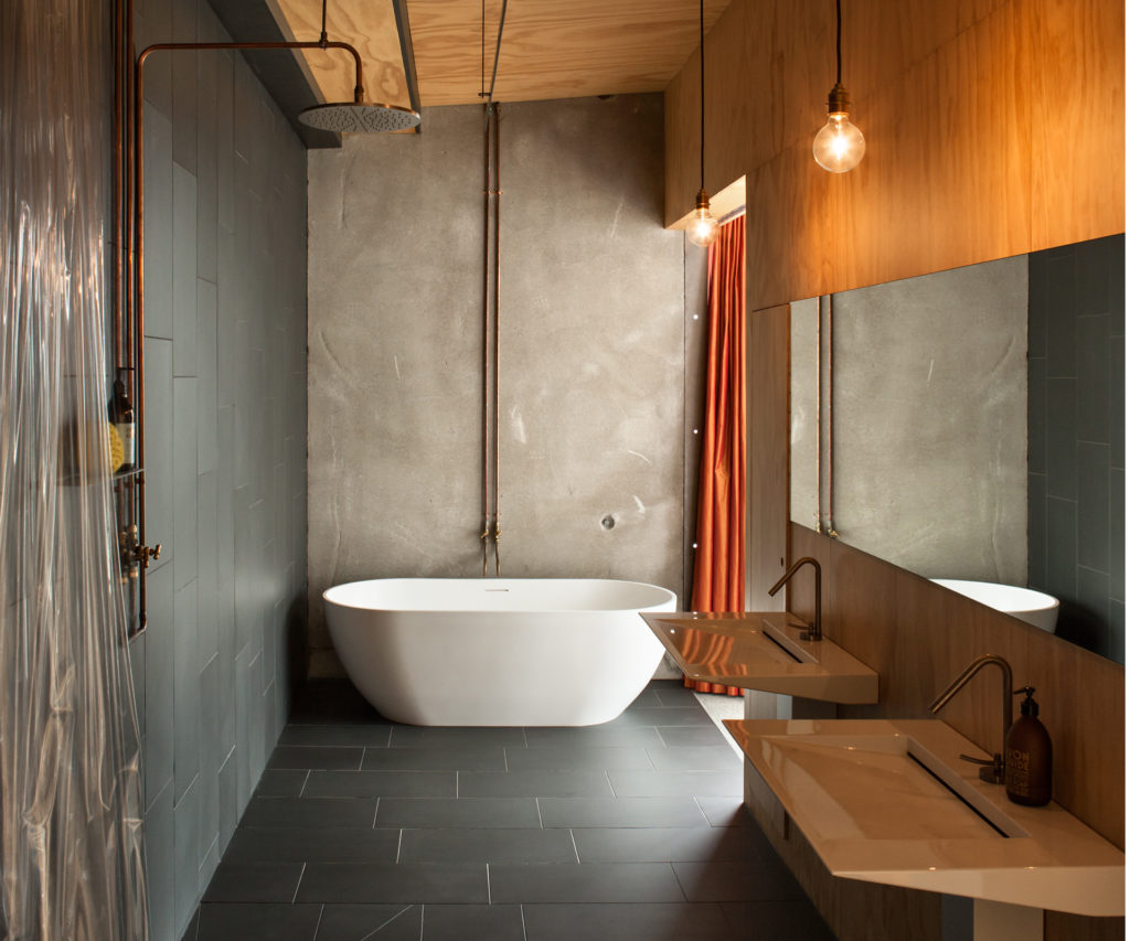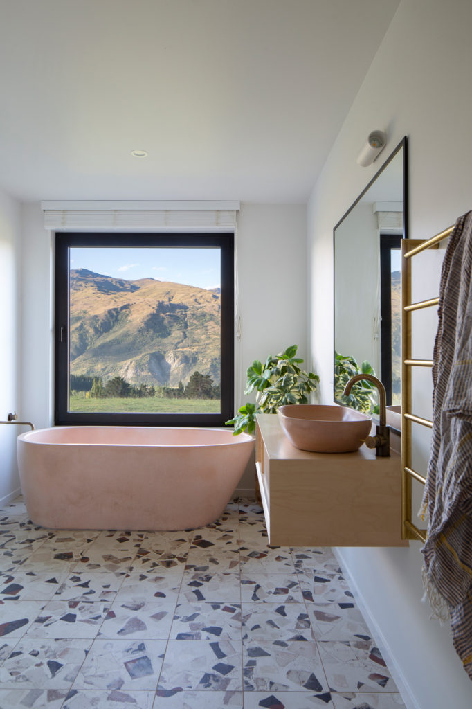 The statement pink-tinted concrete bath and basin were sourced from Concrete Nation, in a tone that is picked up by the chunky texture of the Italian floor tiles.