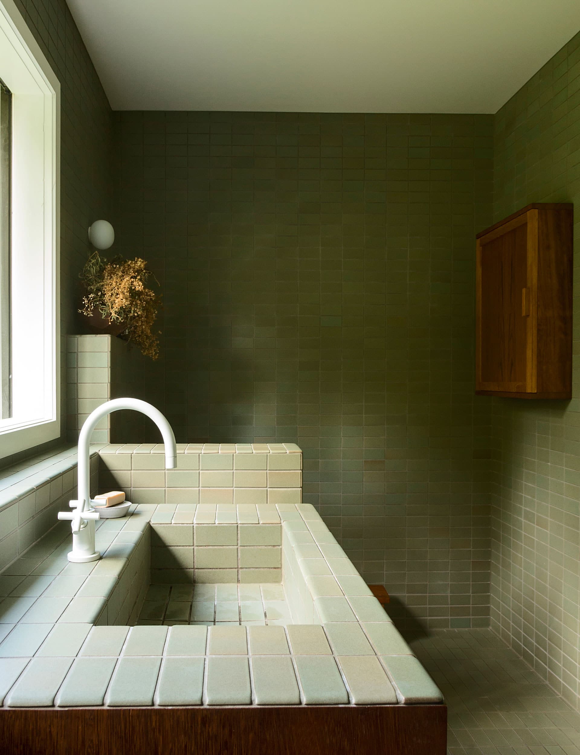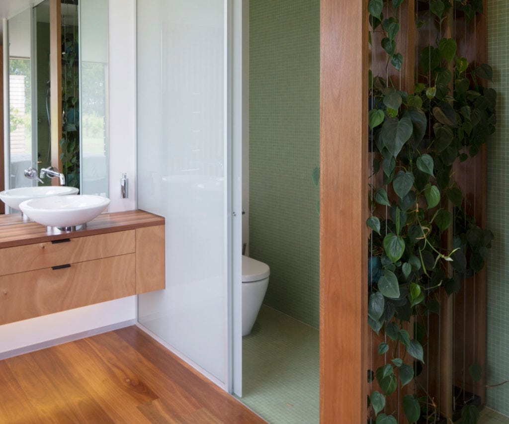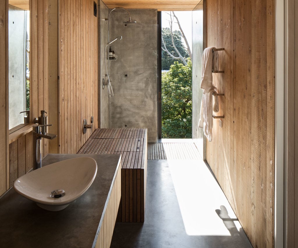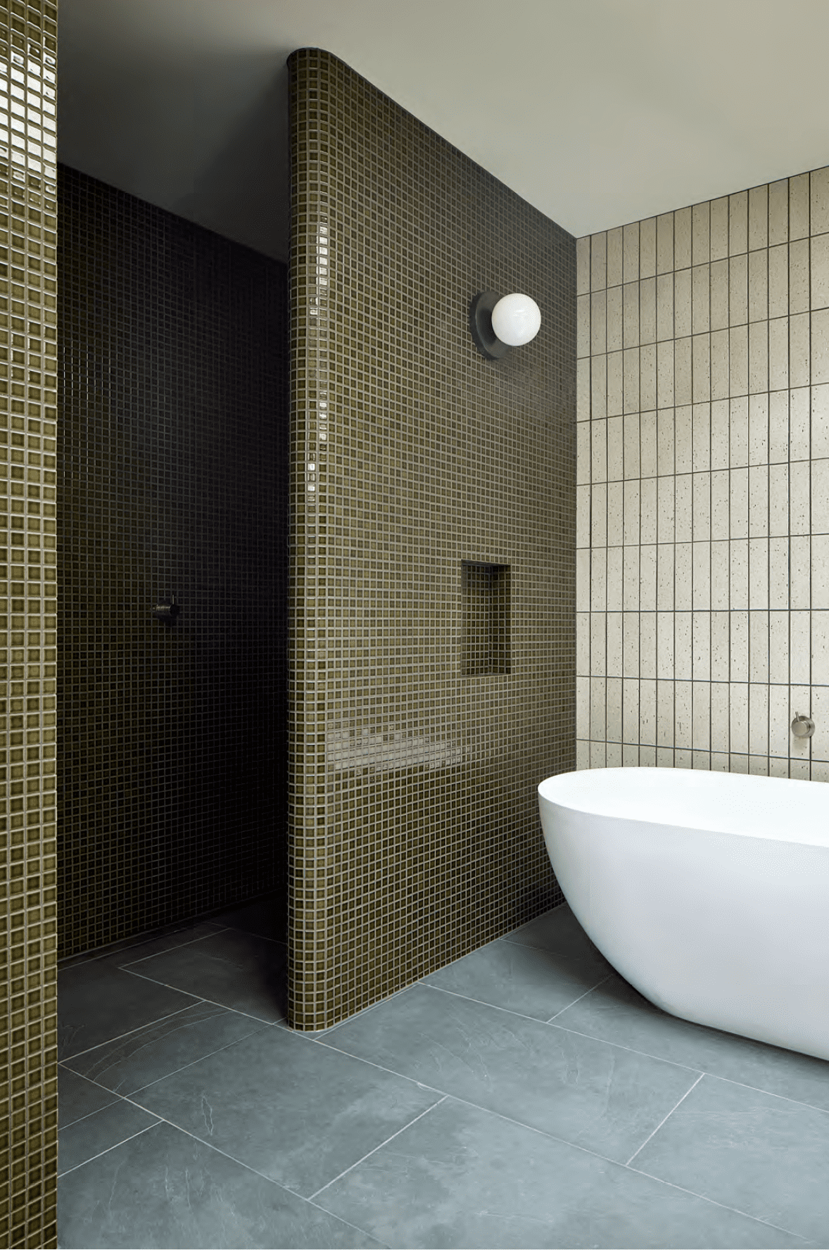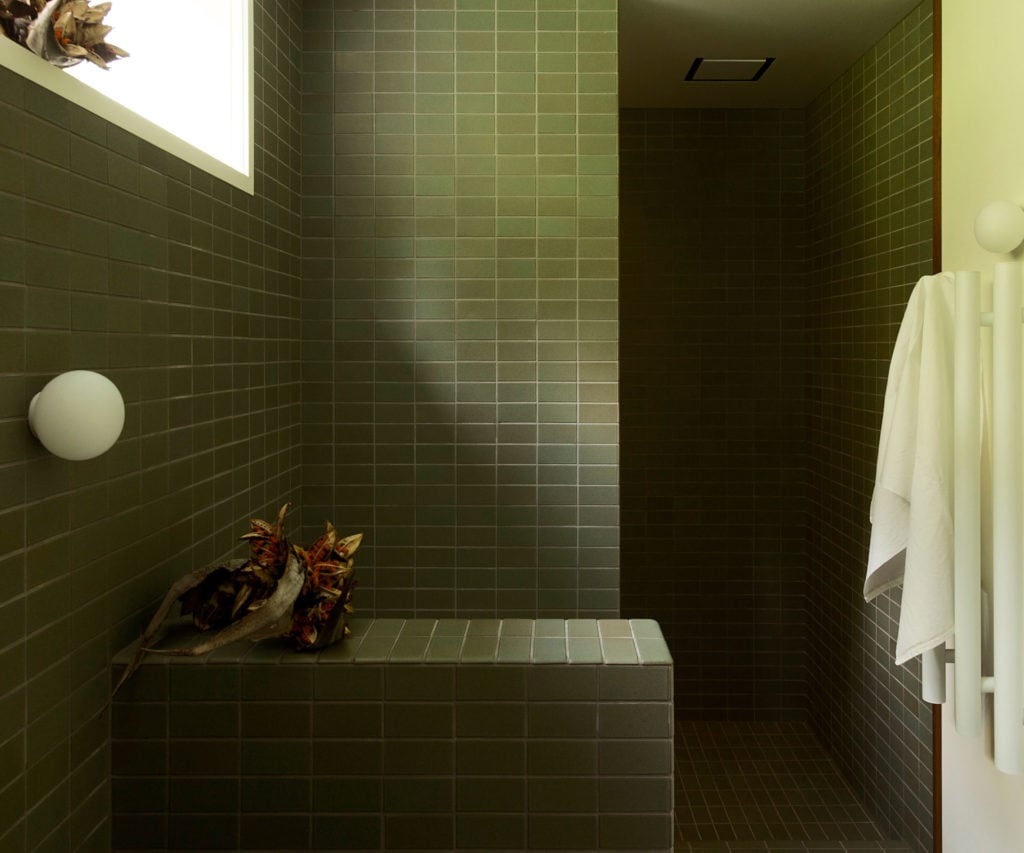 Drawing on modernist and Japanese influences, and recreating the distinctive tonal interplay of dappled light on a forest floor, this Grey Lynn bathroom offers an enchanting take on spatial design where beauty and accessibility coexist.