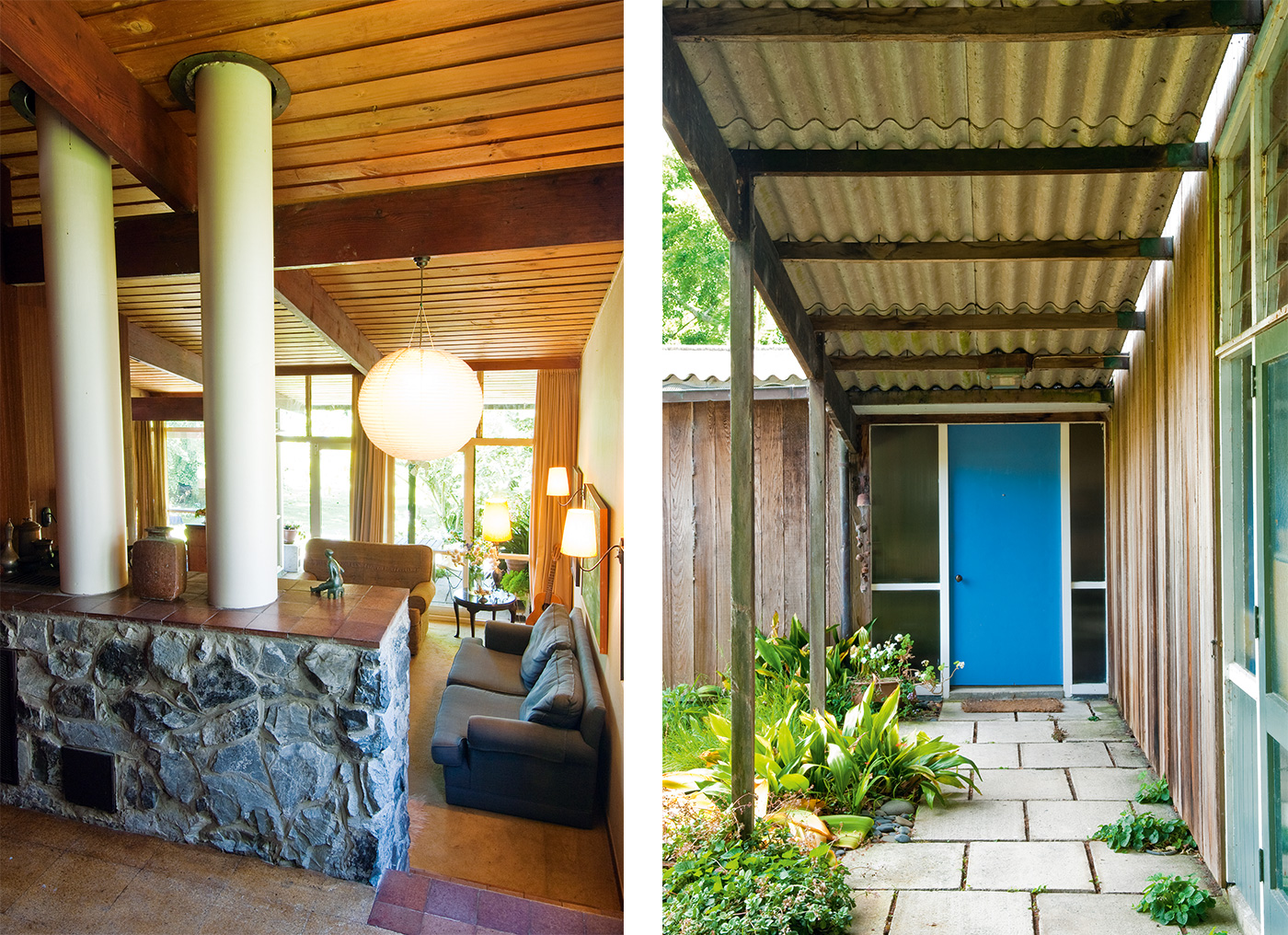 Wartime building restrictions persisted even in 1954, so to extend the floor area of their new house to 1800 square feet, the couple had to produce a certificate to state that a fourth child was on the way. The resulting plan is L-shaped, with family sleeping areas at the end of one wing, and living areas and an artist’s studio at the other.
