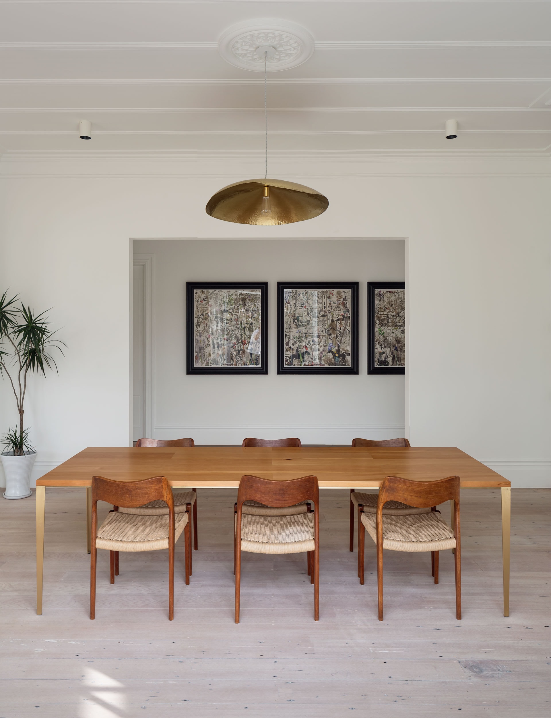The cabinetry doors are clashed with brass that’s been given an aged finish. Powersurge made the clashing and door handles. We designed the dining room table, which was made by Powersurge and David White. It has a brass frame and a kauri top; the wood was salvaged during the renovation.