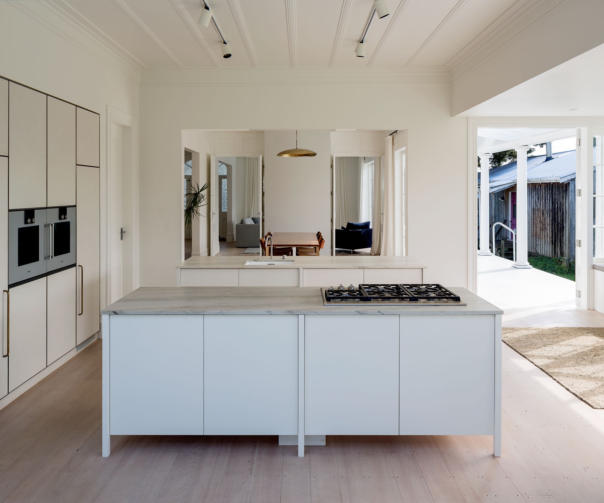Central to the concept is the existing entry hall, from which the living area and dining room are accessed. On entry and when moving through the hallway, there’s a glimpse of each room opening onto one another, then onto the kitchen and sunroom at the rear. Each room connects to a north-facing verandah, which wraps the house. We designed the kitchen cabinetry, material palette and fittings in a contemporary style while maintaining a traditional aesthetic with the island.