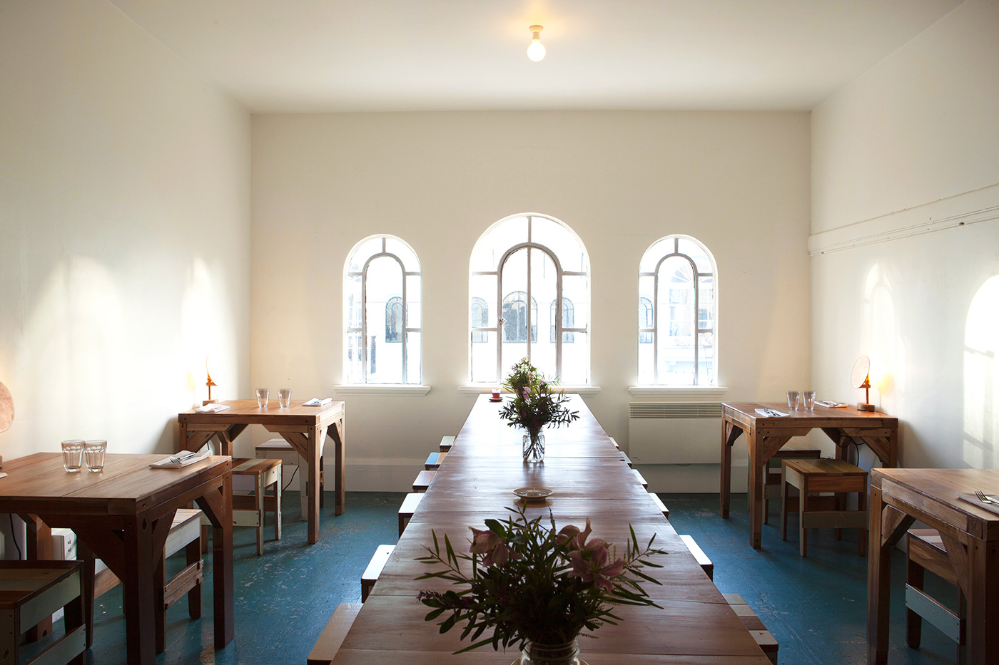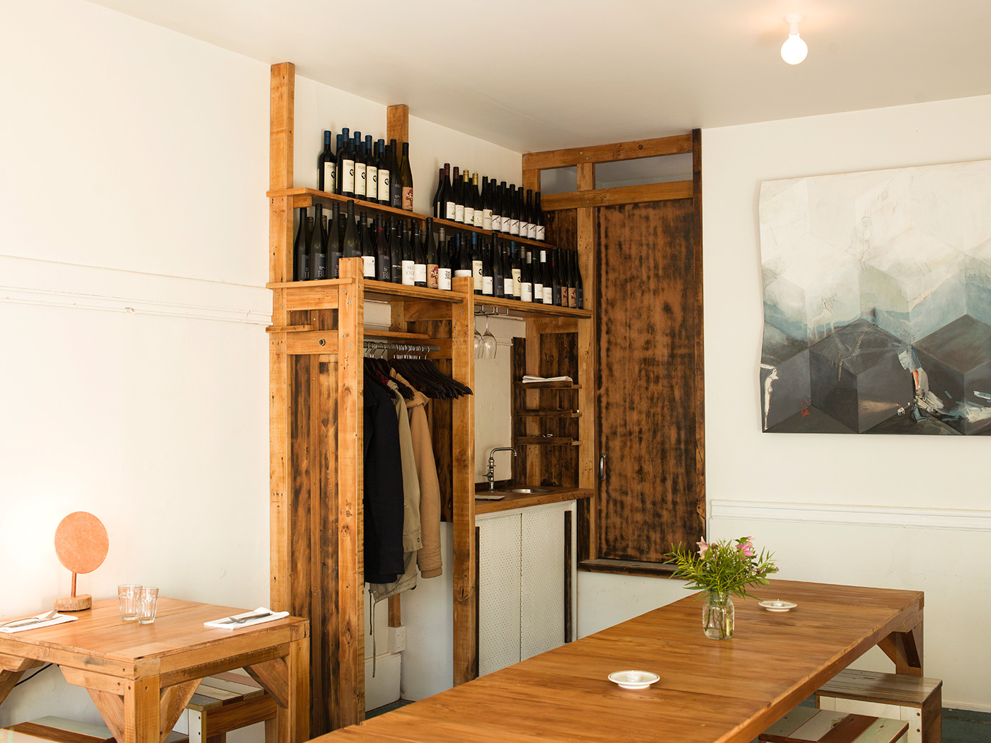 Liz Phelan Juliet agreed that I should use the Rekindle tables that had been the work desks in the studio, so we kept two intact and ran them down the middle of the space, and Rekindle’s builder/engineer Tim McGurk turned the others into two-seater tables. To create the feeling of intimacy and warmth I commissioned Joska Easterbrook from Joska & Sons to make table lamps. Tim then designed and built the service station made of salvaged wood around the existing basin unit. Downstairs we wanted to develop the space to comfortably fit in a few groups of drinkers, so we had a smaller, higher table made, and extended the window leaner along the wall to connect with the bar.