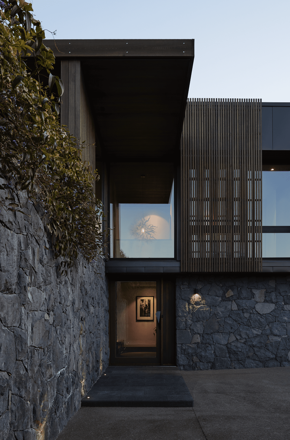 Externally, the stone-filled gabions the Herbst have made famous in their bach designs — at Oruawharo Bay, Kaipara Harbour, Waimauku, Whangarei Heads — have been supplanted by a stone wall of stacked honeycomb bluestone.