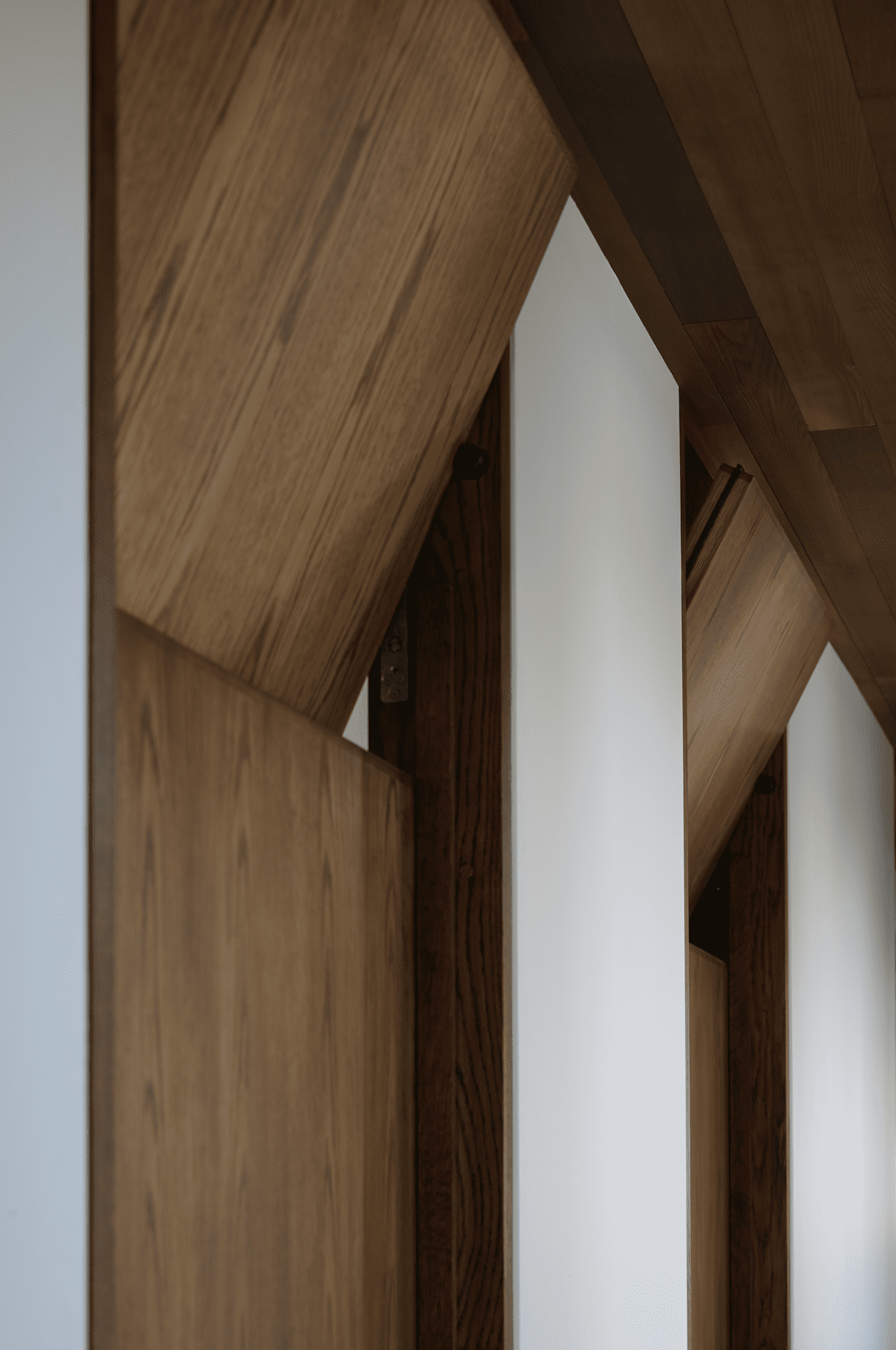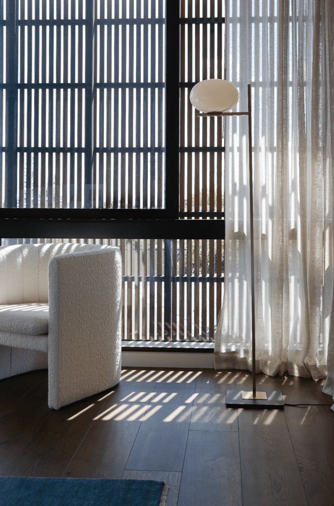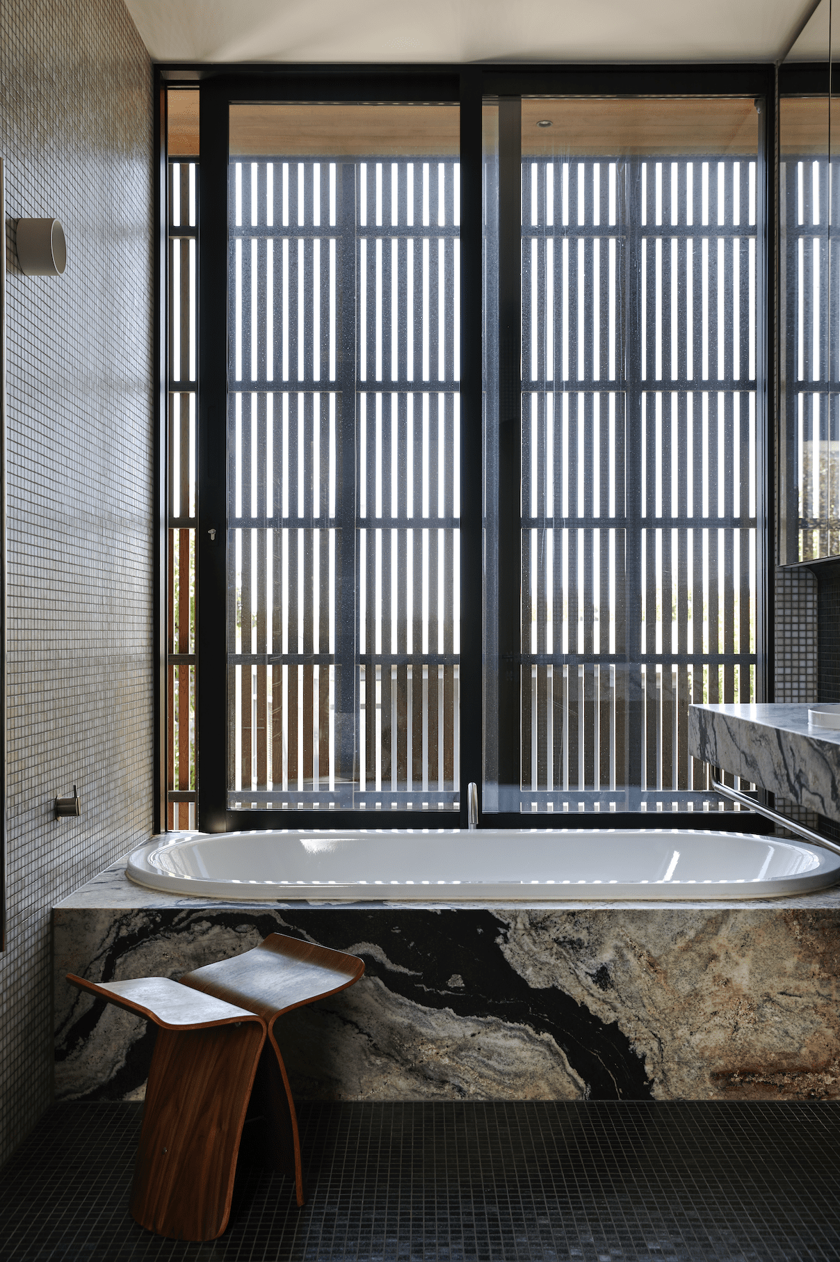 On the other side of this finned veil there is a significant gap before the glazing and the rooms beyond. The architect refers to this buffer zone as a play on Japanese engawa — a traditional space that filters the outside to the indoors. Unlike engawa, however, this one is not a traffic zone or a verandah.